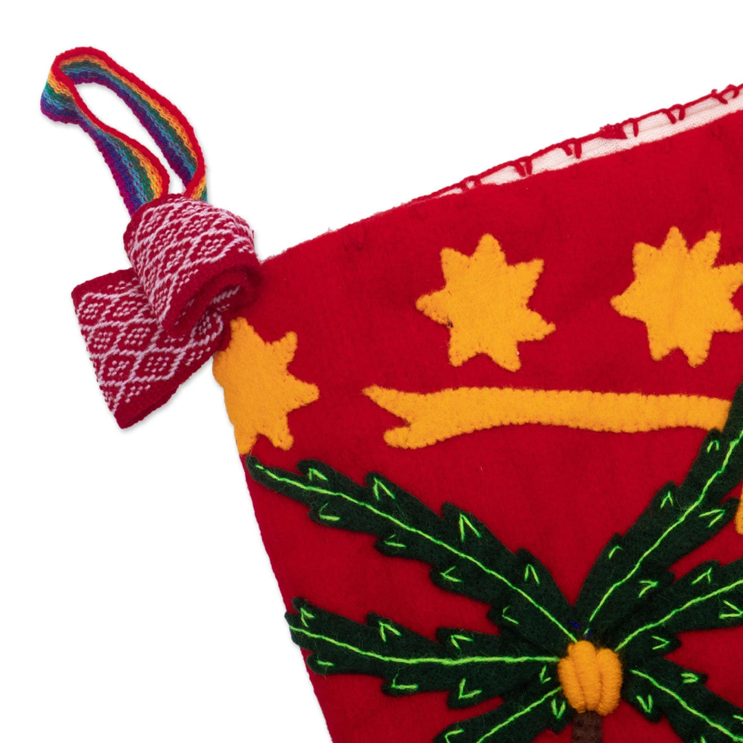 The three Wise Men wake their way to the manger to greet the newborn king on this beautiful Christmas stocking from Leonor Quispe. The artisan works in the folk art style known as arpilleria, which is a three-dimensional applique. The vibrant stocking is completed with a rainbow-striped hanger and a red and green pompom.