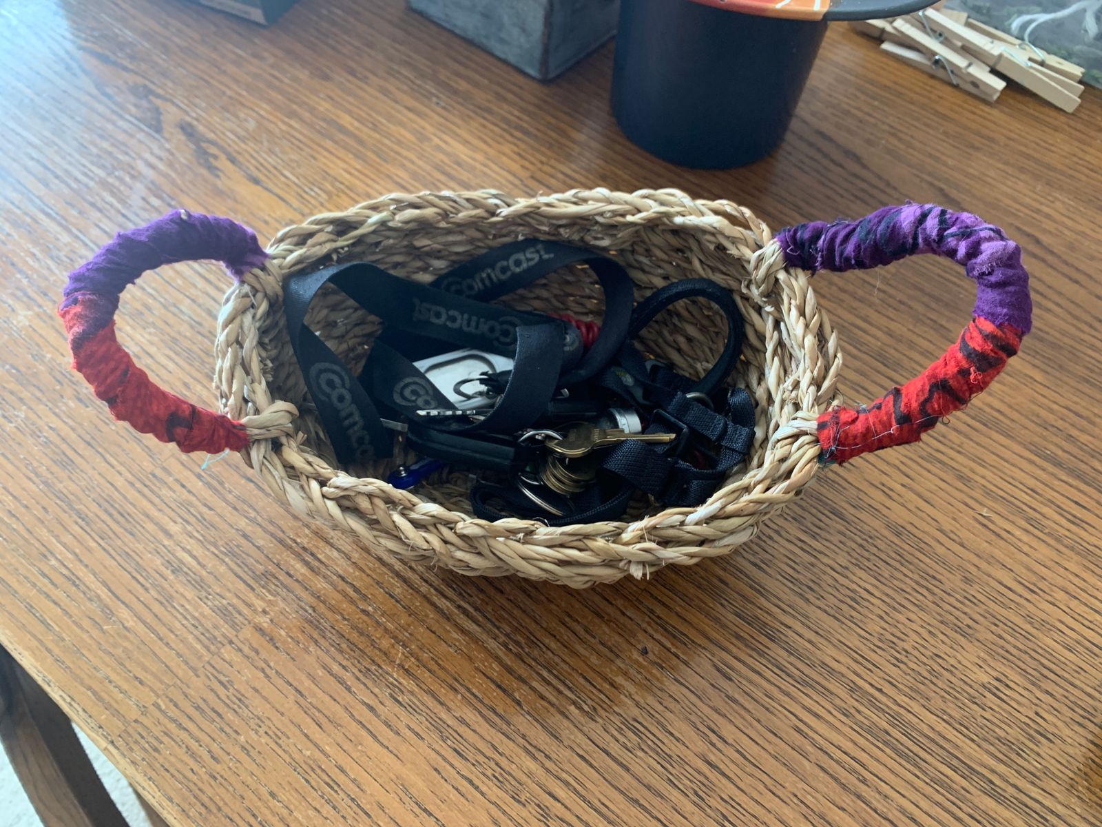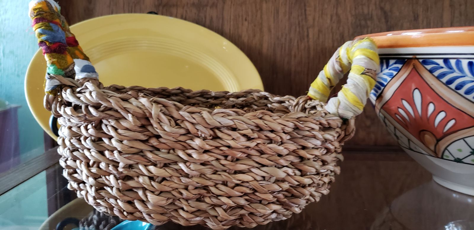 Materials: Natural fiber (grass/leaves), upcycled Indian textiles.
