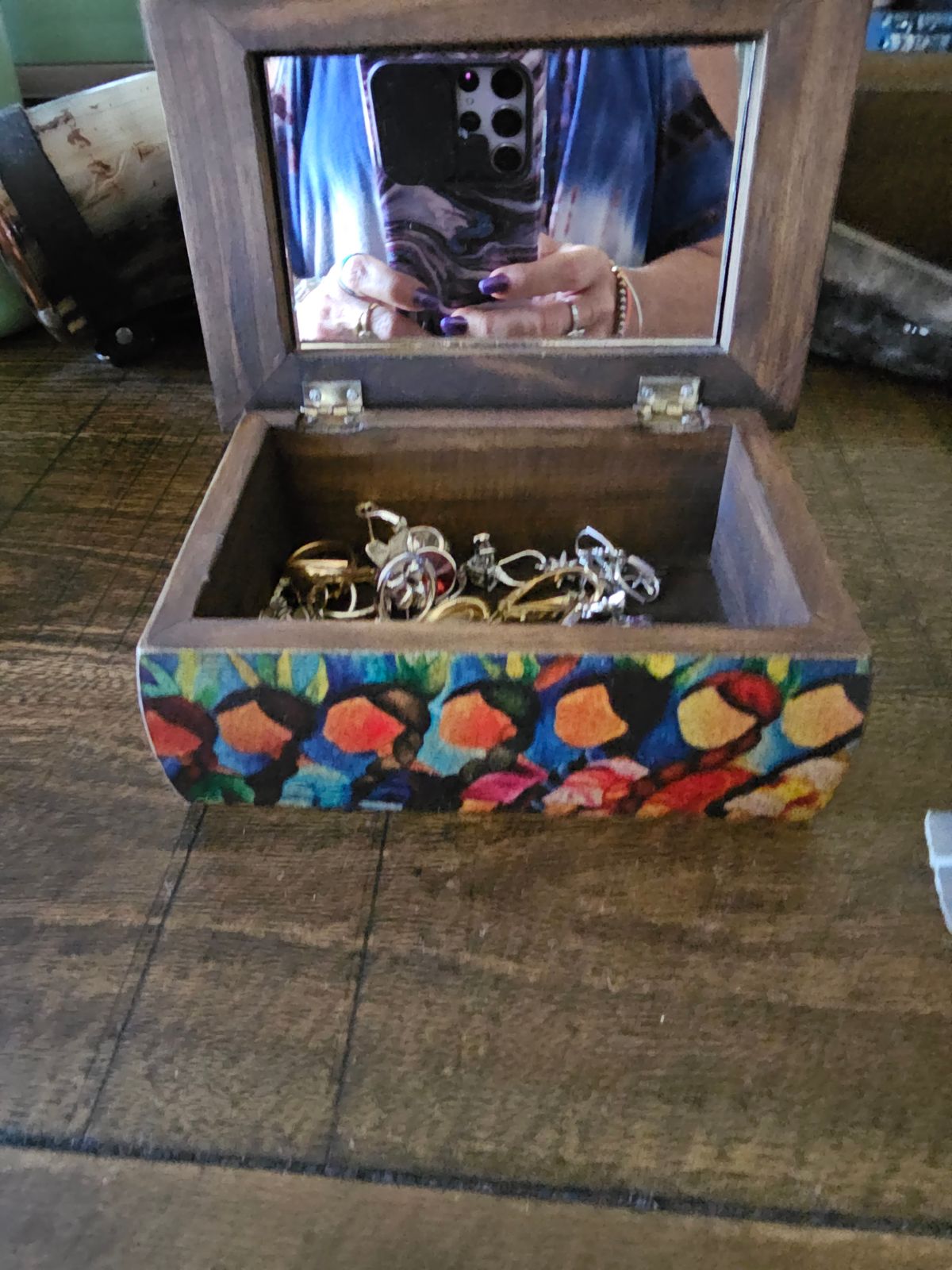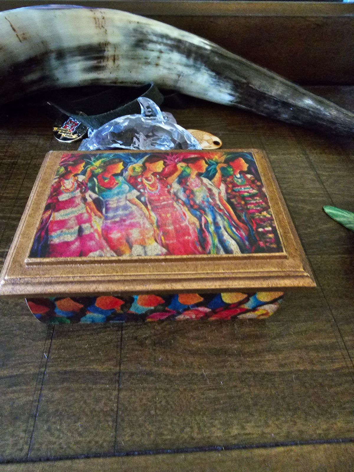 Ana Maria González honors Huichol women with the design of this fabulous jewelry box. Featuring a mirror of the lid, the decoupage on pinewood jewelry box is crafted by hand in Mexico.