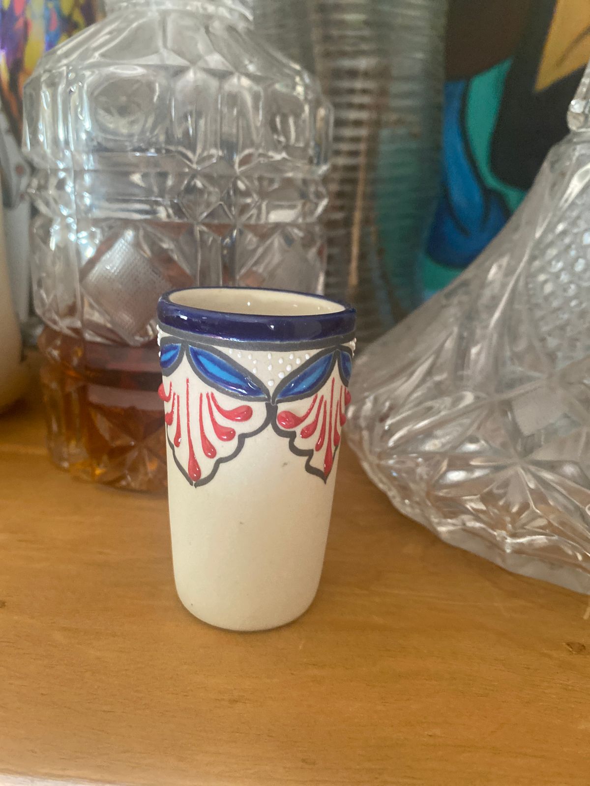Bring a touch of Mexican charm to your bar with these striking Talavera-style ceramic tequila cups. Handcrafted by artisan Armando Sobreyra using time-honored techniques, each cup boasts exquisite hand-painted details that make them as beautiful as they are functional. Their cobalt blue rims and vibrant red and blue leafy motifs reflect the rich tradition of Talavera pottery while adding a pop of color to your drinkware collection.