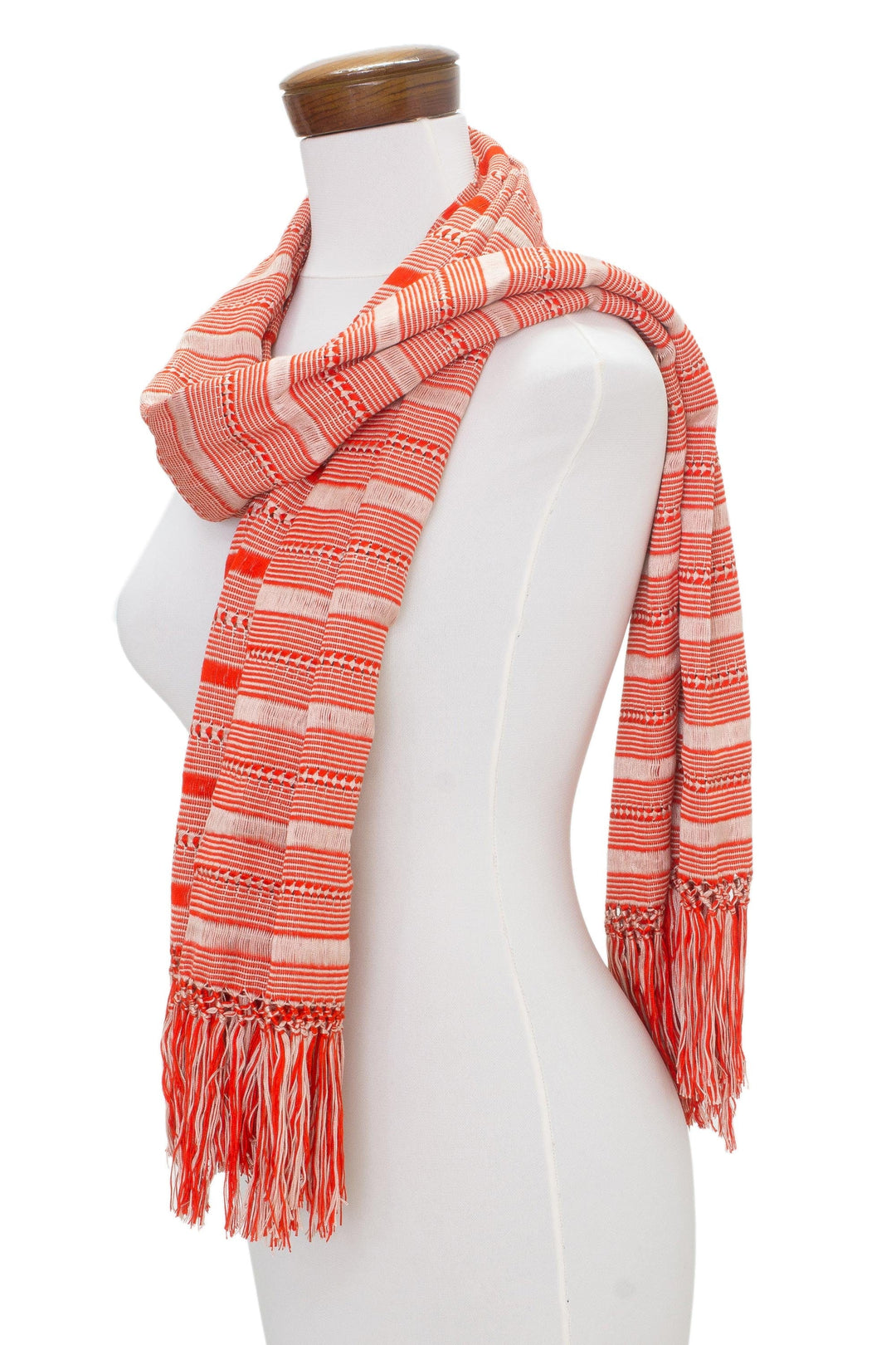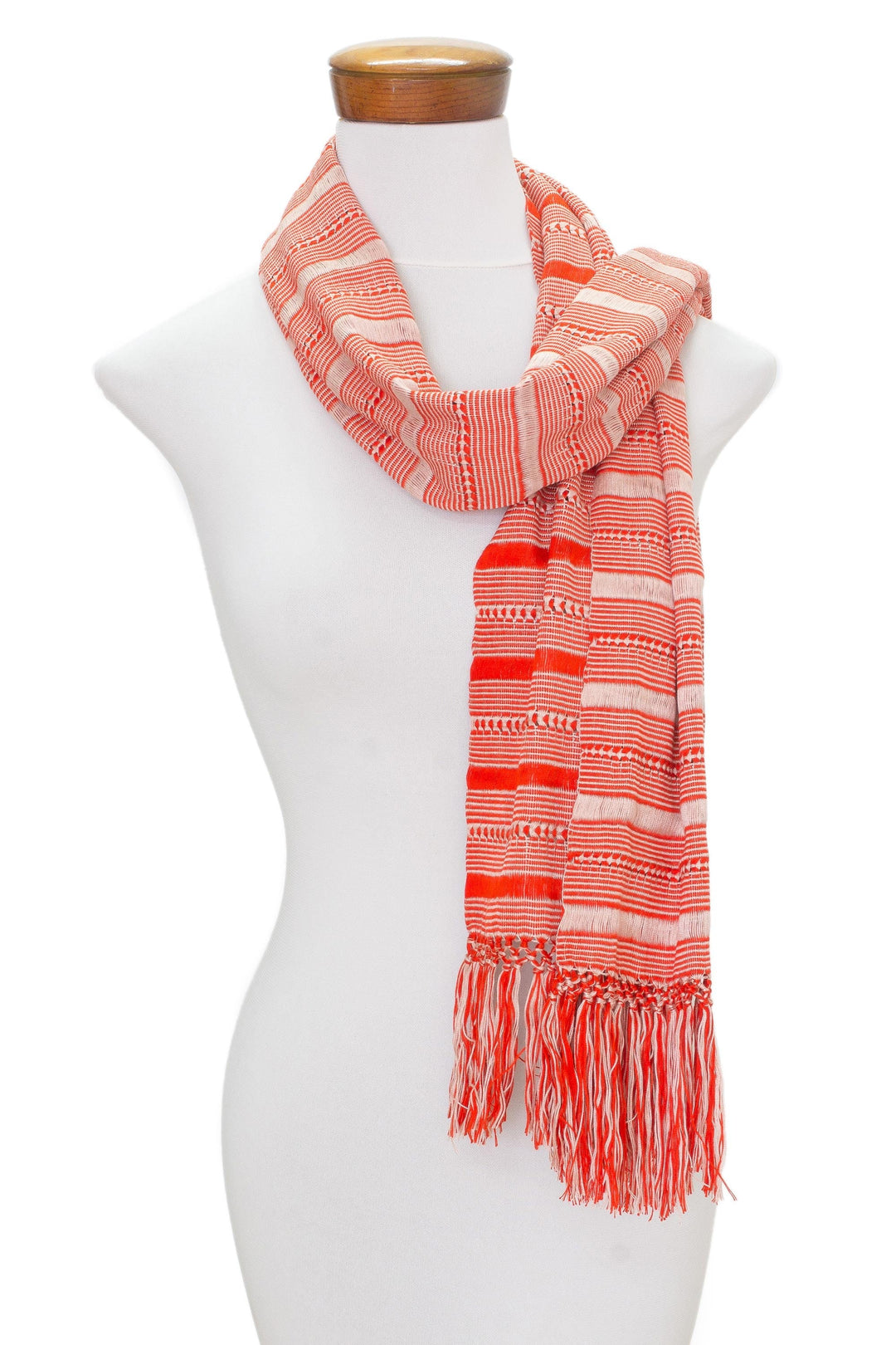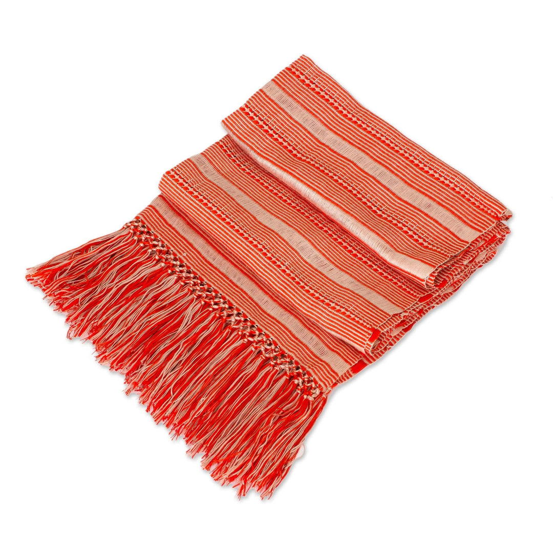 Threads of bisque and candy apple red make a sweet combination in this wrap scarf. Guatemala's Women Artisans of Santa Cruz hand-weave the soft rayon scarf into a striped pattern using a backstrap loom. Long tassels complete the attractive design.