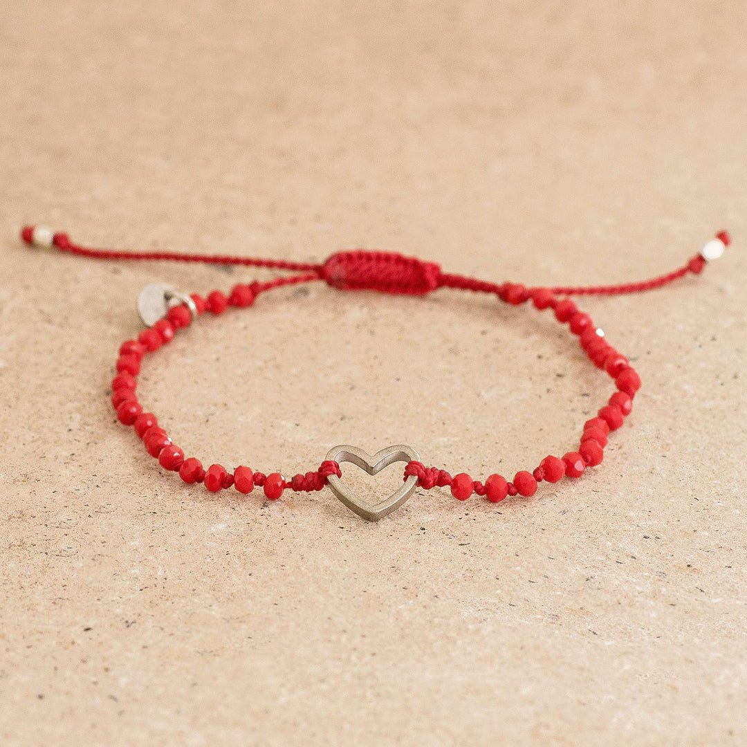 Using macrame techniques, the artisans of Wakami craft this pretty adjustable bracelet. The red cord bracelet is strung with red crystal beads and features a central heart pendant made of Zamac. A sliding knot allows you to adjust the length as desired.