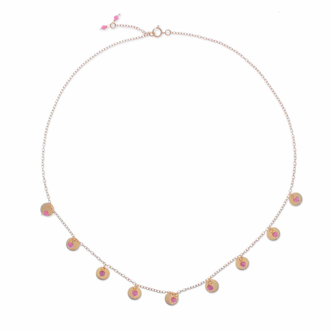 Some hearts enjoy adding color, artistry and creativity to the elements that surround them, embodying the energy of the tourmaline beads that embellish Somsiri Juntamin's creation. Made in Thailand, this 18k gold-plated sterling silver charm necklace arranges the pink jewels around shiny pendants, all in a matte finish that captivates with sweet grace.