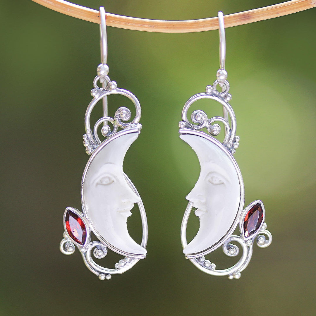 Framed by elegant dotted rawa and bun wire work in sterling silver, two crescent moons are carved by hand from bone. Balinese artisan Made Wardika designs these dangle earrings, accentuated by marquise gemstones of faceted garnet.
