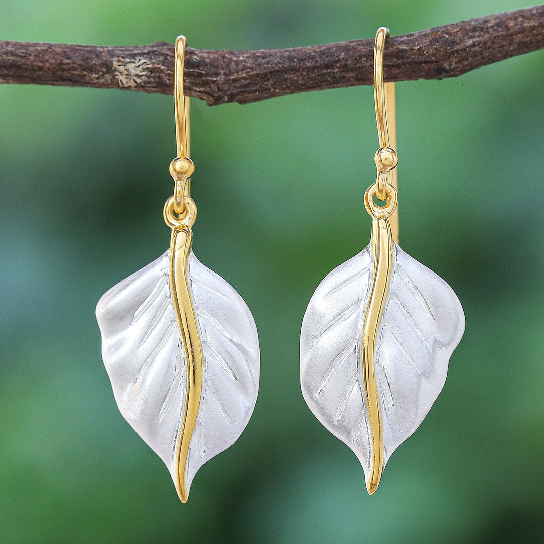 Bisected by a river of gold, Lalana's dangle earrings are inspired by the natural beauty of leaves. The Thai artisan uses sterling silver to hand craft the leaf motif, engraving the precious metal with subtle details. Accented by 18k gold-plated sterling silver hooks, the earrings shimmer and sparkle beautifully.