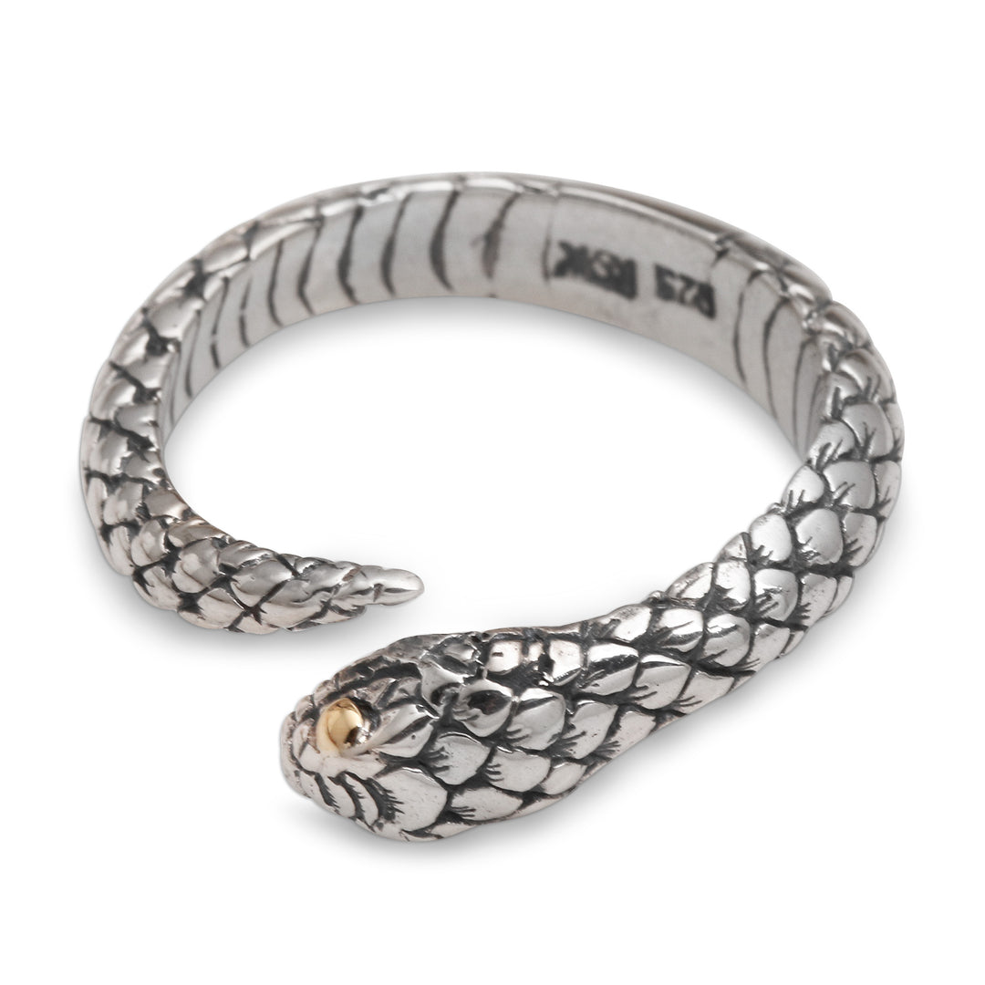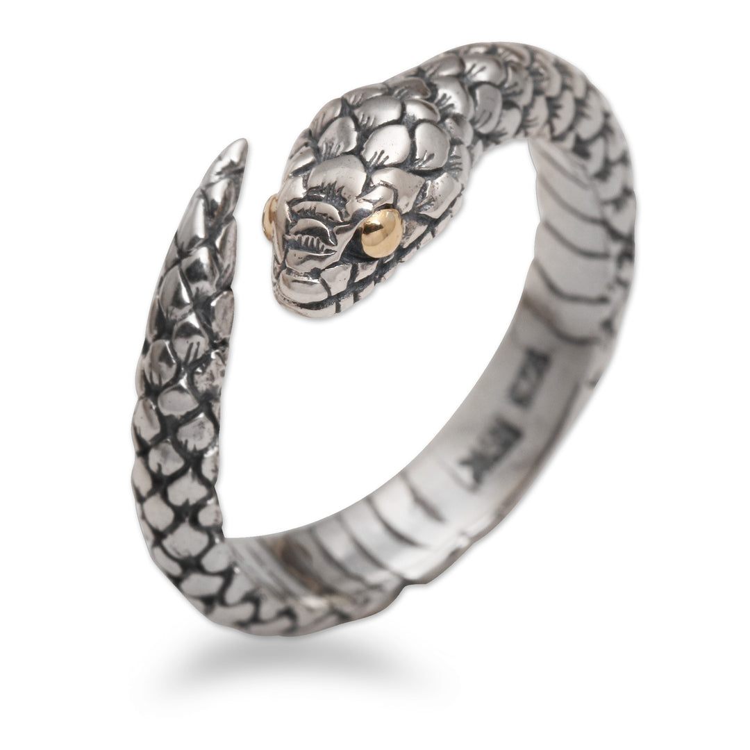 This captivating wrap ring is the original design of Bali's Putu Gede Darmawan. The realistic snake is crafted from sterling silver, with ever-watchful eyes are bathed in 18k gold.