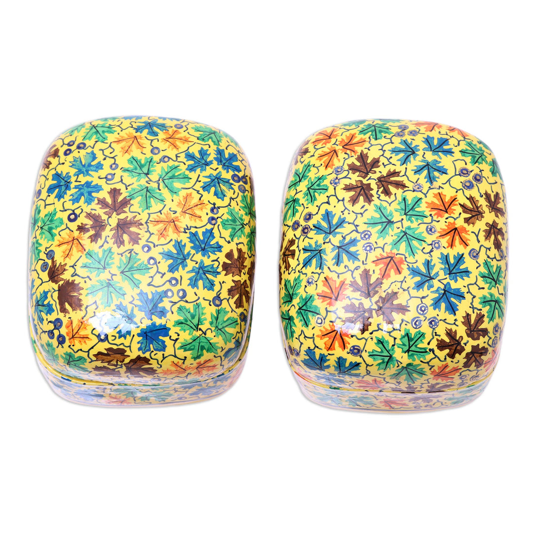 Handcrafted of weeping willow wood with a papier mache layer that gleams brightly, this pair of decorative boxes is designed by Indian artisan Sajad. He hand-paints each box with multicolored chinar leaf motifs over yellow for a lovely addition to your home decor.