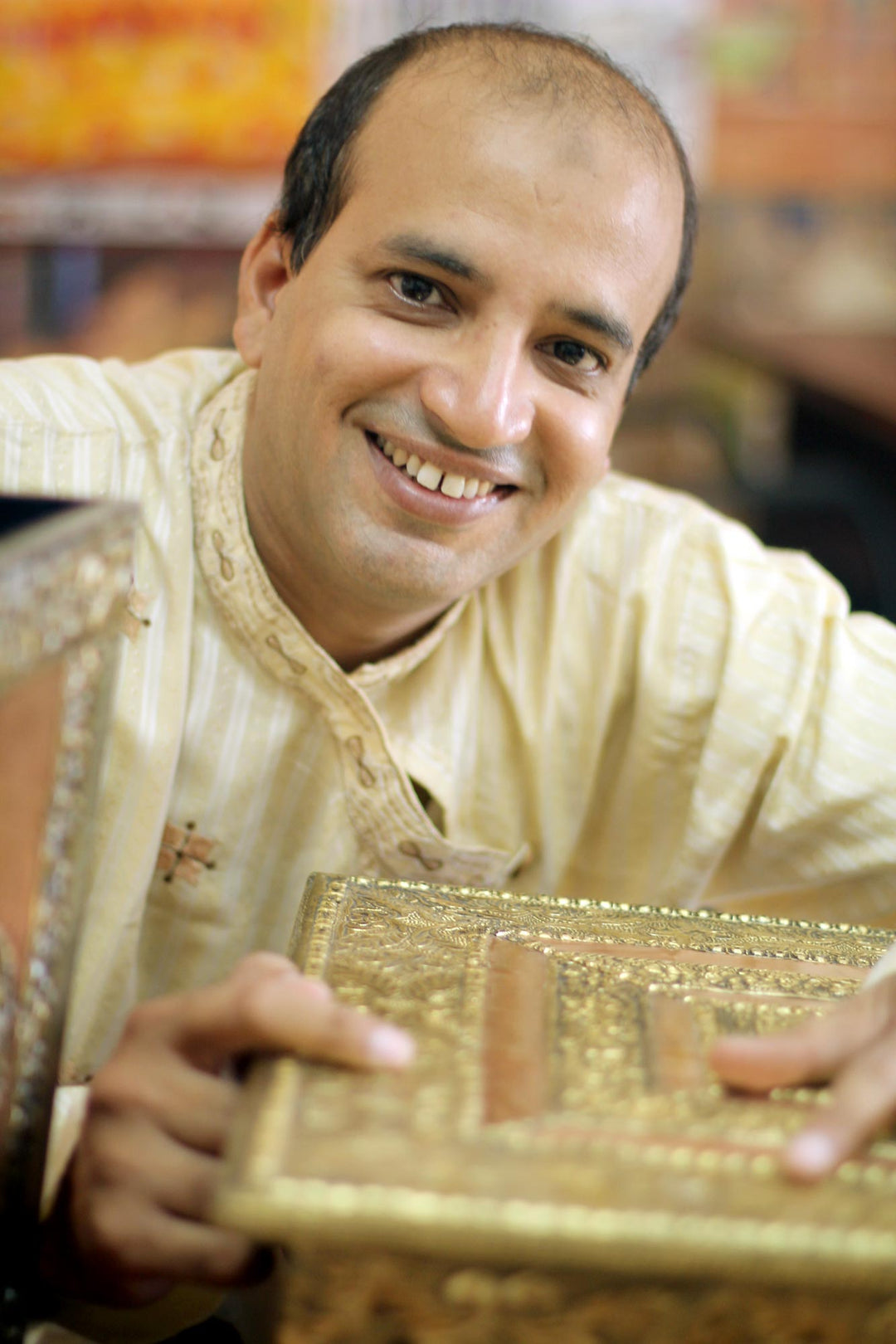 "When I joined NOVICA 16 years back, I use to do patra work on mirrors and jewelry boxes, and then created upholstered stools and fusion tile with patra work. Fabric stools, ceramic knobs and wall hooks, brass key holders, brass door knockers and photo frames are some of the products that I started creating subsequently and added to my collection of products which were liked and appreciated by the NOVICA customers.