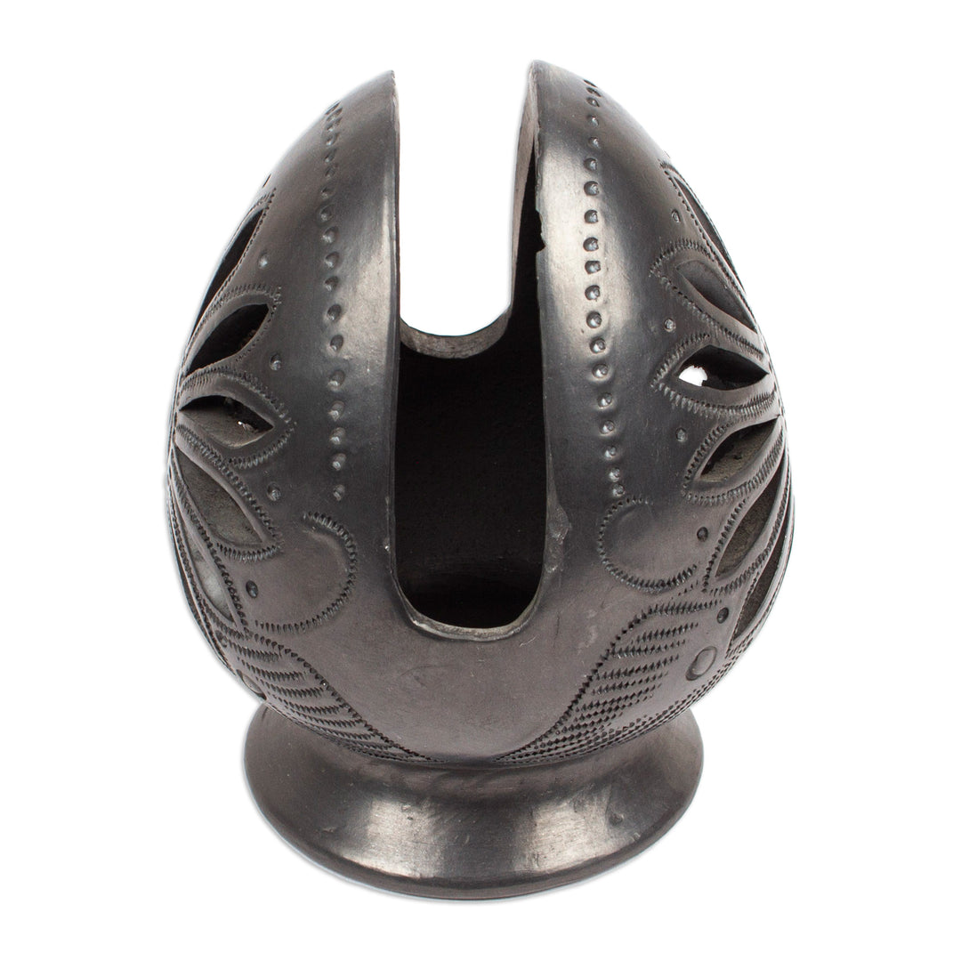 This egg-shaped barro negro napkin holder is handcrafted by artisan Anakarem of Oaxaca, who works as a team with his father. Barro negro, literally translated as 'black mud,' is a type of pottery from clay only found in Oaxaca, Mexico, and crafted using traditional methods. The black color comes from the clay itself, enhanced during the firing process. This napkin holder has a flower on each side made through a combination of embossing and decorative cutouts.