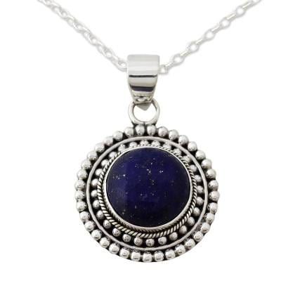 Glistening like a clear sky at dusk, a circular gemstone of precious lapis lazuli shines in this hand crafted sterling silver pendant. Neeru Goel of India presents this sterling silver pendant necklace, reminiscent of a royal sunset on a summer evening.
