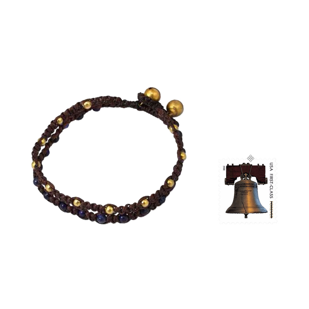 Tiraphan Hasub evokes boho chic with the design of this bracelet. She braids the dark brown bracelet by hand with macramé techniques, expertly adding lapis lazuli and brass beads. The bracelet closes with a ringing brass bell. According to Buddhist customs, ringing bells bring good luck.