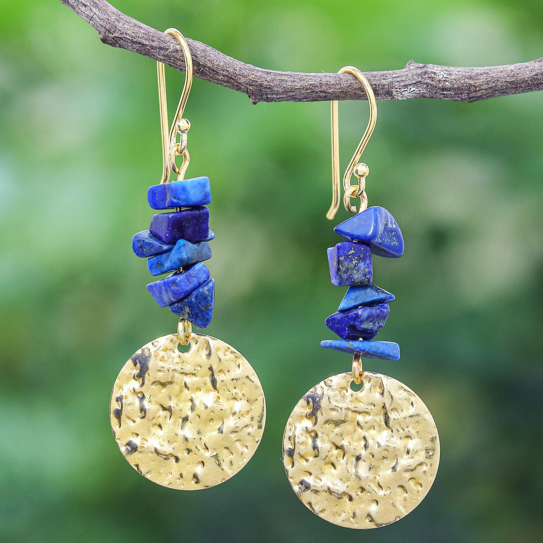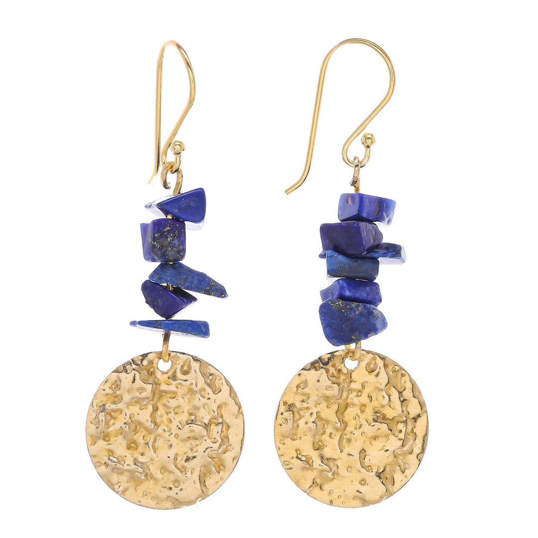 Thailand's Matta presents these shimmering dangle earrings, which feature rich blue lapis lazuli chips dangling from 22-karat gold-plated hooks. Below, hammered brass discs complement the gems by catching the light from every angle.