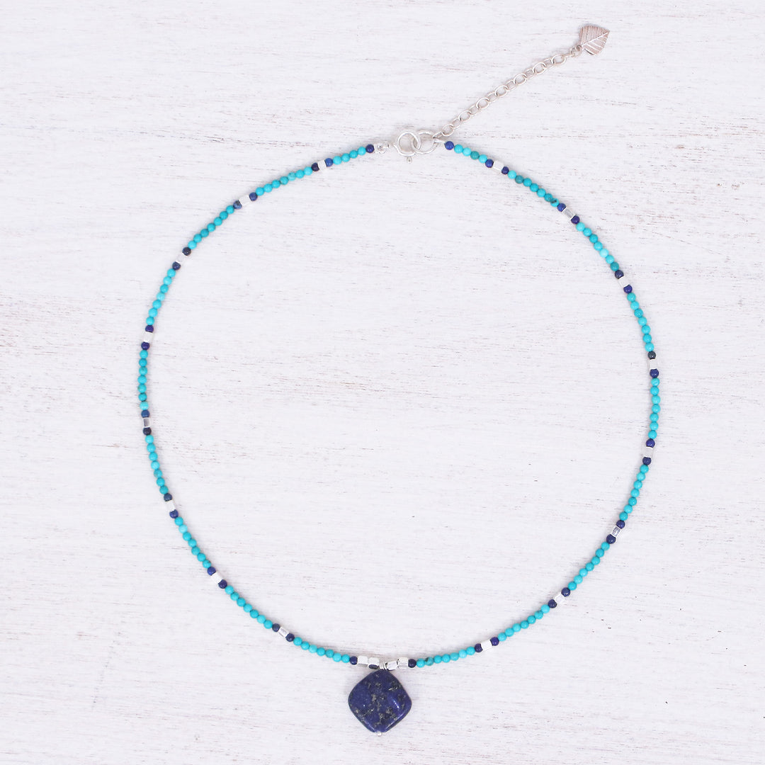 Thailand's Somluck Komolmith demonstrates her eye for fine detail and manual dexterity in this hand-beaded pendant necklace. A polished square of lapis lazuli commands your attention, and is complemented by a beaded pattern featuring smaller lapis beads, howlite beads, and tiny cubes of zinc-plated brass. The necklace features a spring ring clasp and extender chain of sterling silver.