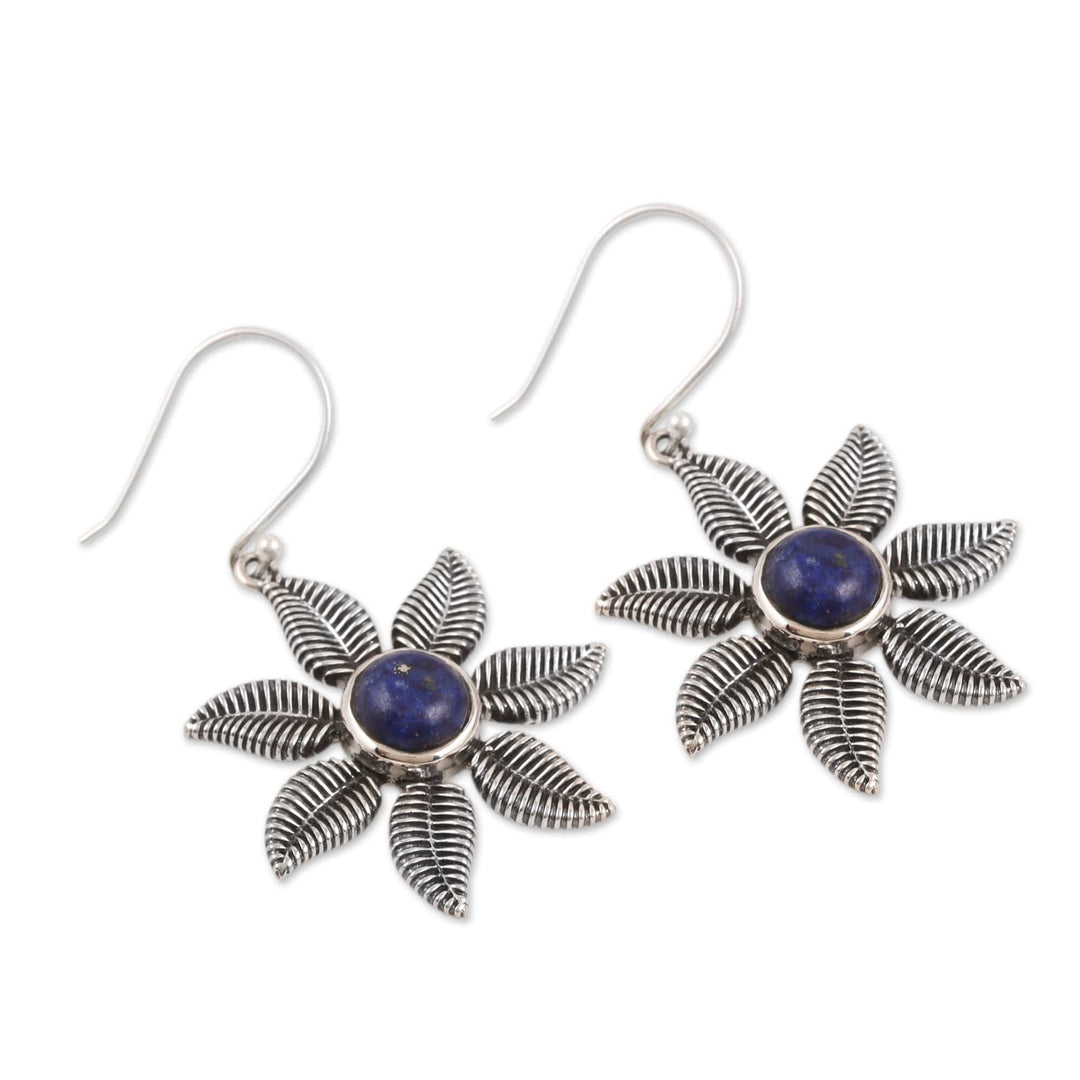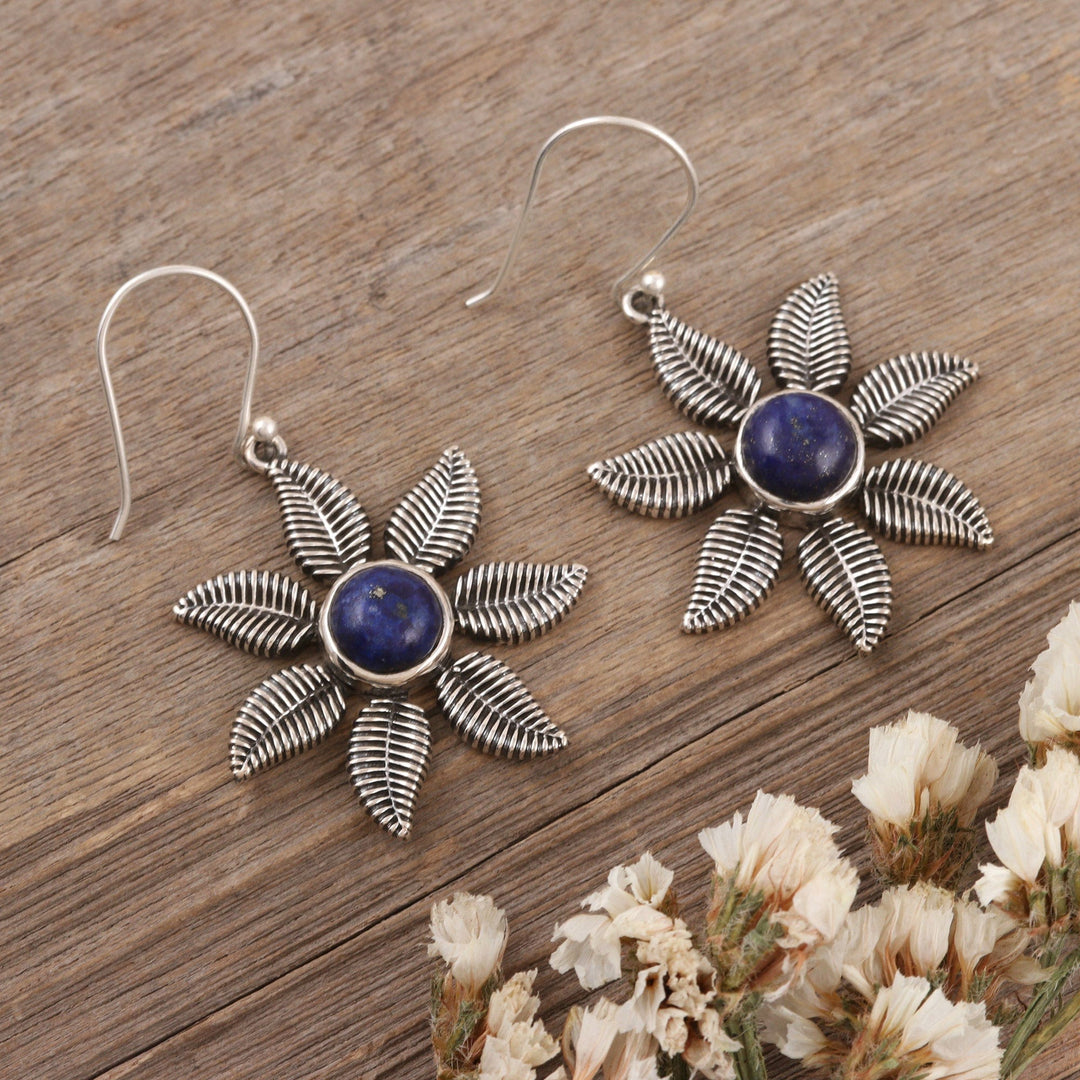 Sterling Silver Dangle Earrings with Lapis Lazuli Stones - Royal Leafy Blossom