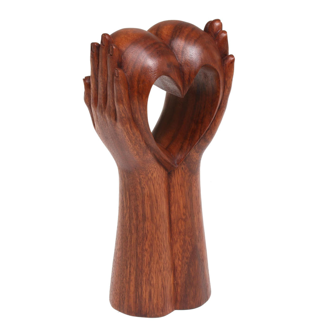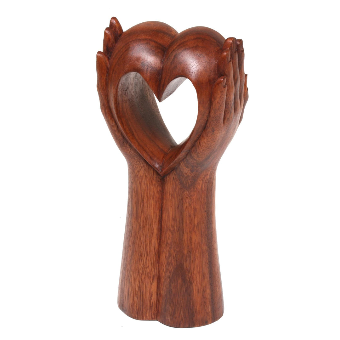 A favorite theme of Wayan Dirga, expressive hands communicate deep emotions. Two hands cradle an open heart in a gesture of devotion. 'They symbolize the faithfulness of a lover,' the artisan confides. The signature sculpture is carved of warm Balinese suar wood.
