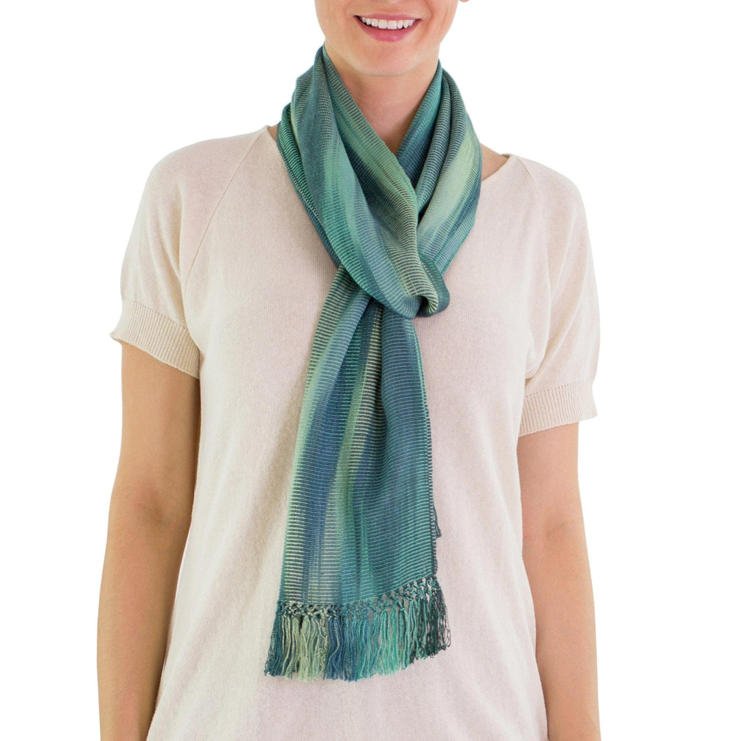 Hand Woven Rayon Scarf in Light and Dark Green - Iridescent Emerald