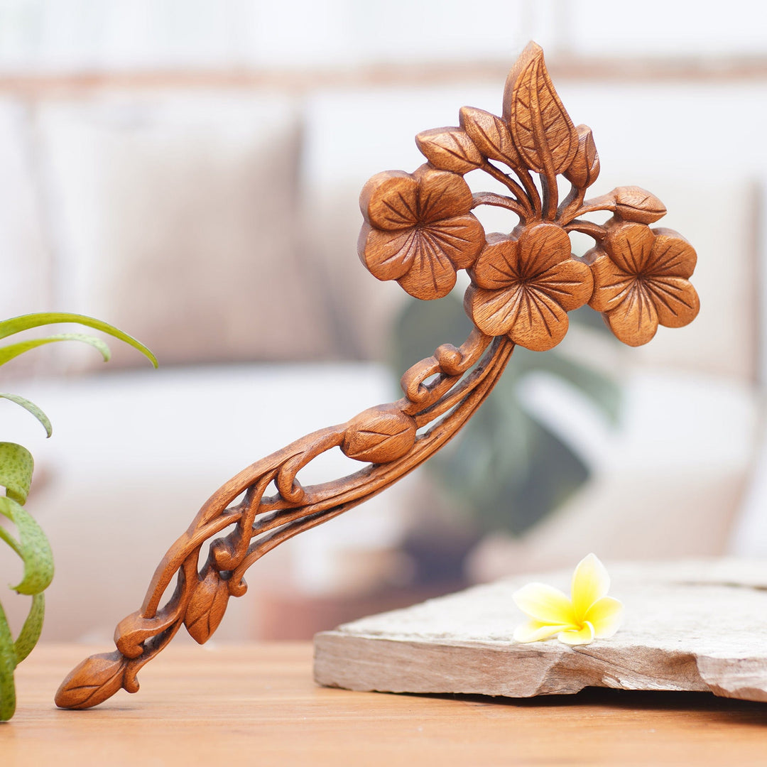 Luxurious leaves caress three precious plumeria blossoms, carved by hand of suar wood. By Seji Taram, this exquisite relief panel celebrates the gifts of nature.