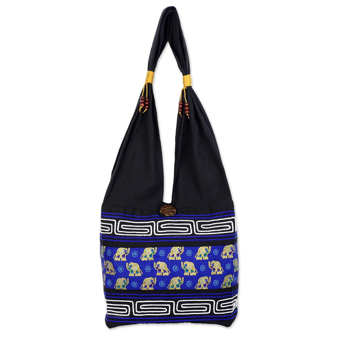 Thai artisan Jiap Rojjana designs this stunning cotton blend shoulder bag that closes with a coconut shell button. Traditional Thai elephants march across a vibrant sapphire background, with blue and white embroidery completing the design. Golden thread and rain tree wood beads adorn the black straps. The inside of the bag features a black cotton lining and a zipper pocket.
