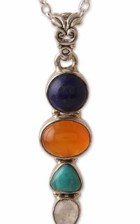 Attract positive energies while wearing a graceful creation made by talented artisans from India. Alok Jain's sterling silver pendant necklace features a polished finish with glamorous gemstones in a bezel setting, including lapis lazuli, carnelian, rainbow moonstone and reconstituted turquoise jewels.