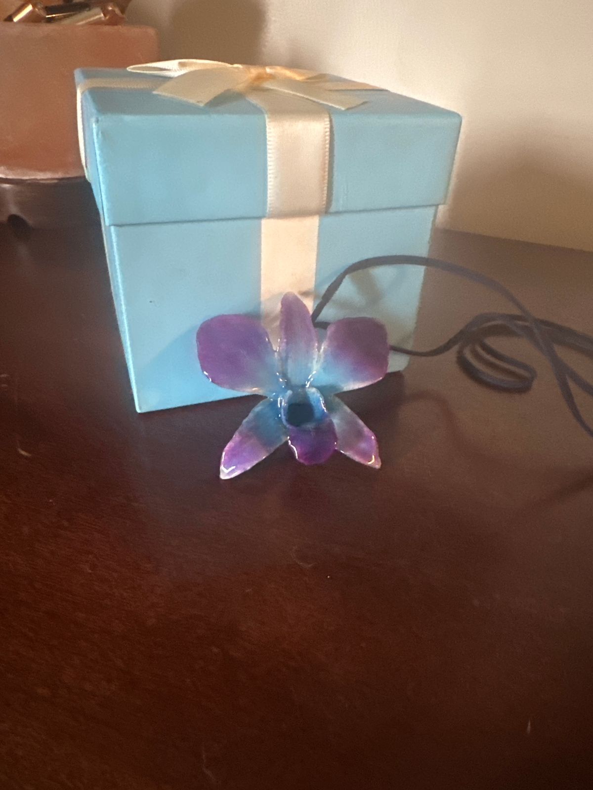 Showcased on a navy blue suede cord, an orchid centers this very long necklace. Danai's design immortalizes a natural flower, its color tinted to midnight blue. Globes of sodalite finish the cords, and the length can be adjusted by sliding the pendant on the cord.
