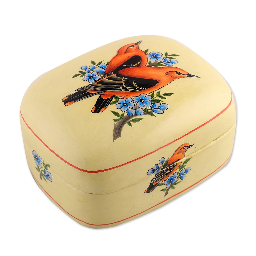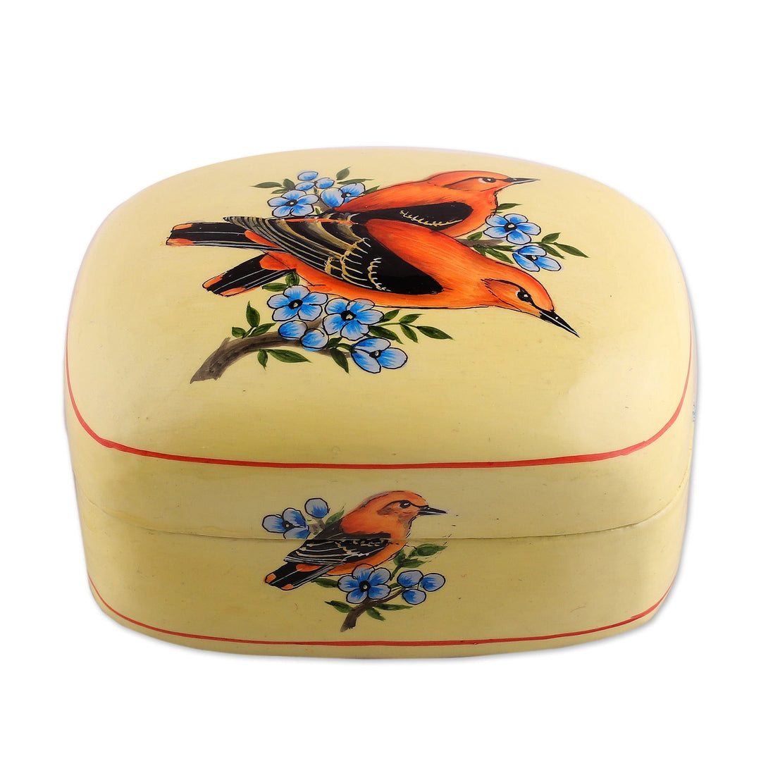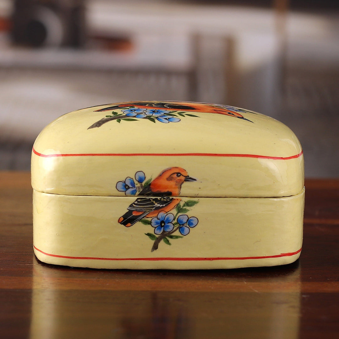 Bird-Themed Painted Yellow Papier Mache Decorative Box - Our Summer
