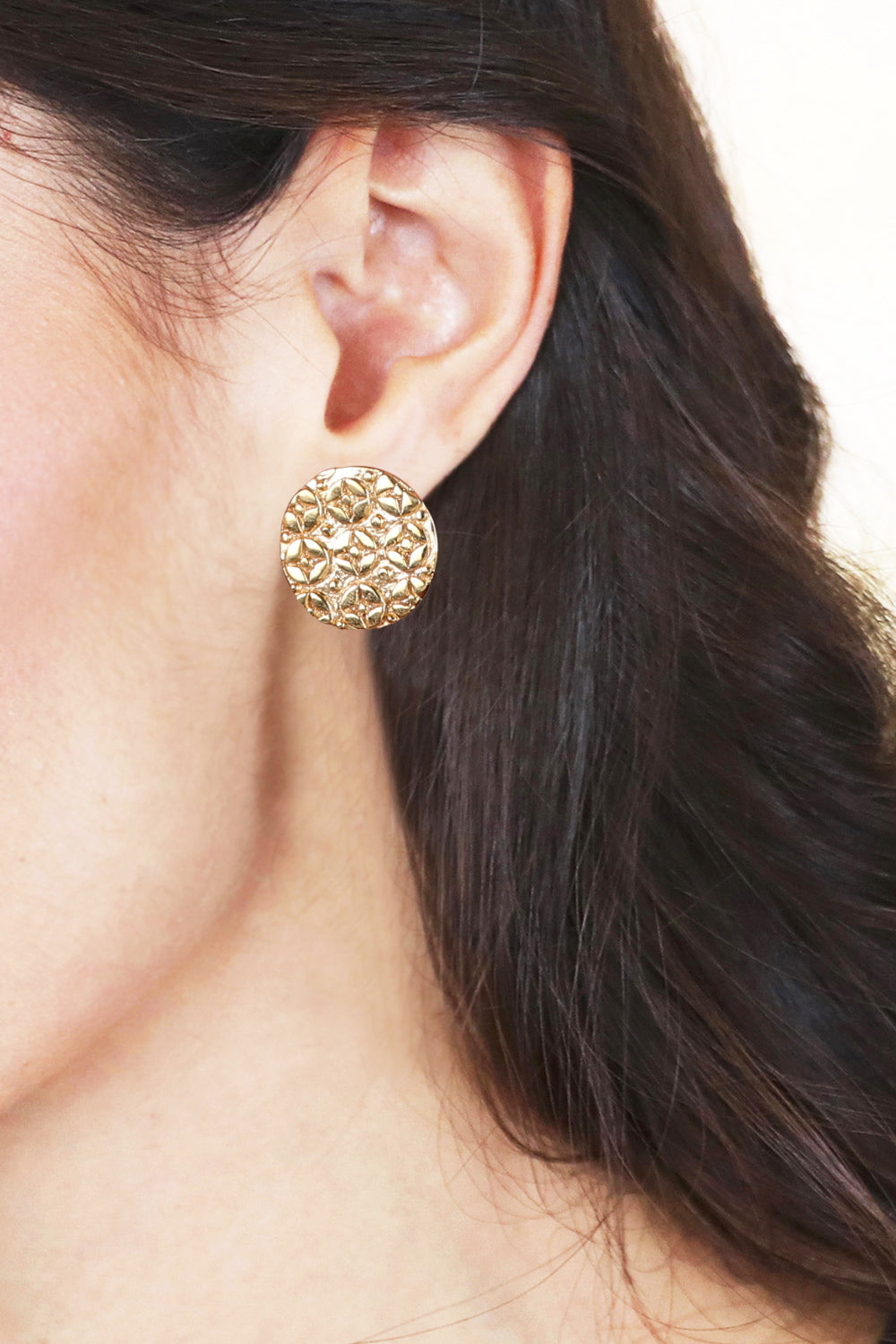 India's luxurious artistry decorates these button earrings with the grace of a starry night. Characterized by graceful beauty, Ritu Malpani's newest design is crafted from refined brass and embossed with an enchanting star pattern.