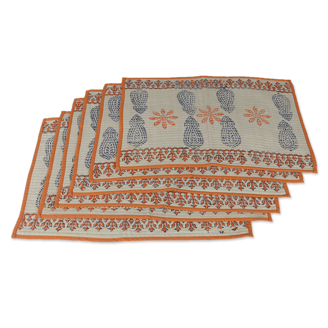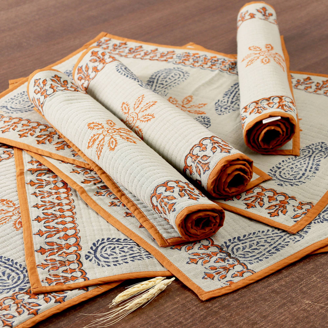 Block-printing techniques allow Sandeep Malhotra's newest collection to exude regal vibes. A team of master artisans—based in India—use ancient techniques to decorate this cotton table runner and six placemats with palatial beauty. The accessories reunite glorious tangerine and ivory hues, infusing your table with joyful grace.