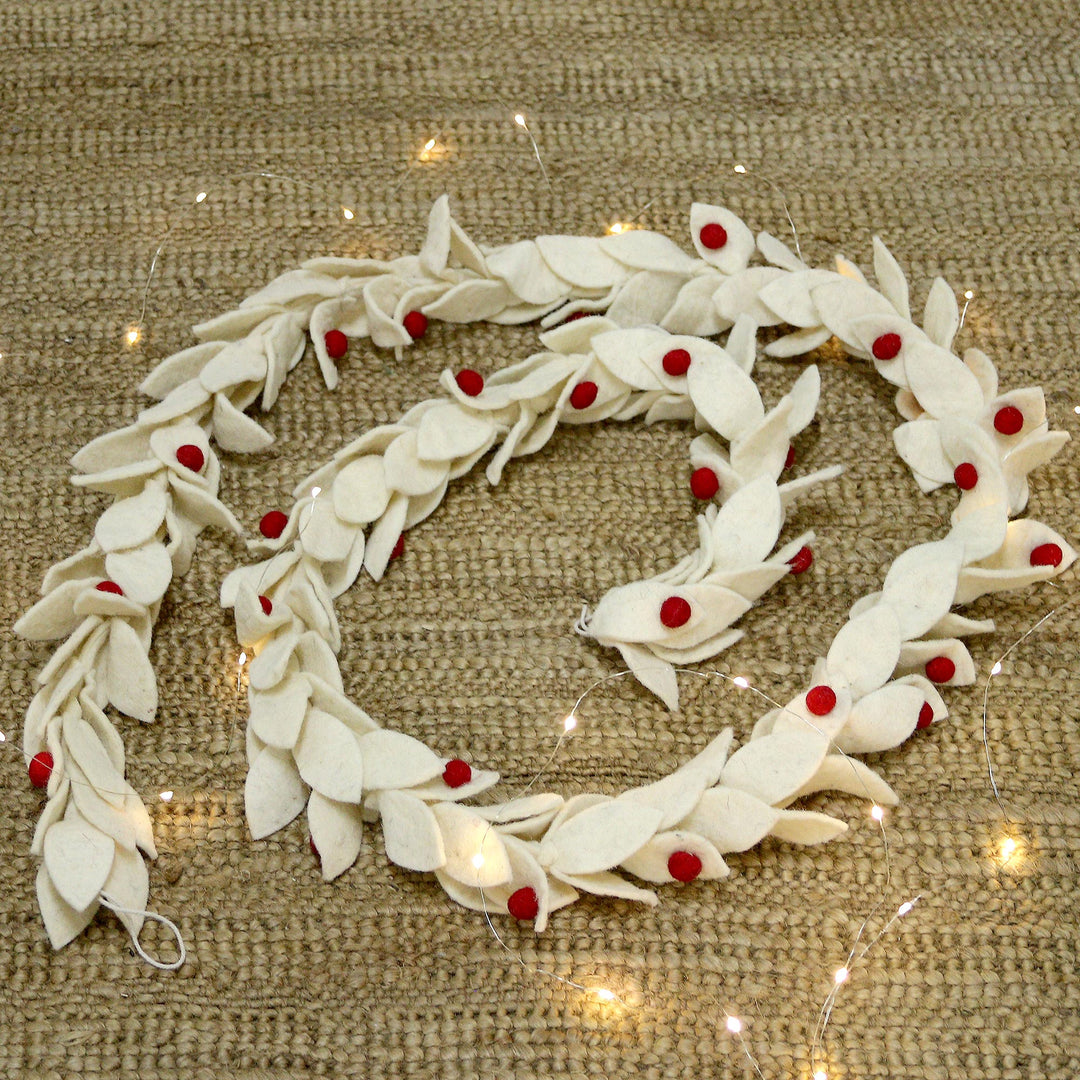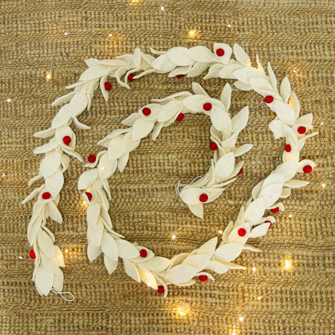 Wool Felt Leaf Holiday Garland in White and Red from India - Winter Decorations