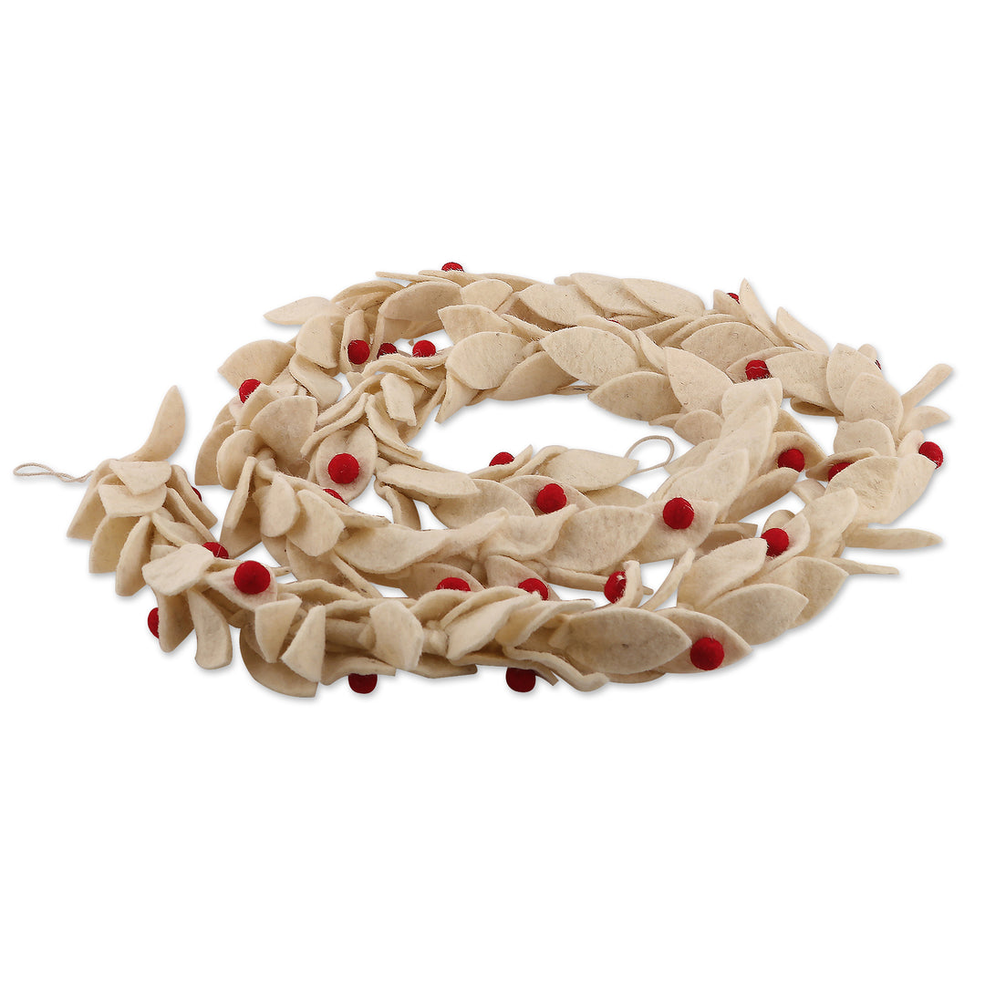 In a festive ode to the winter season, the artistic flair of India's Ashish Mehta takes center stage with this gorgeous garland expertly handcrafted from wool felt. Enchanting white leaves intertwined with delicate red pom-poms reminiscent of cherries adorn the design with a touch of nature's whimsy. Dangling from cotton cords, this lovely accessory arrives fully prepared to grace your cozy spaces.