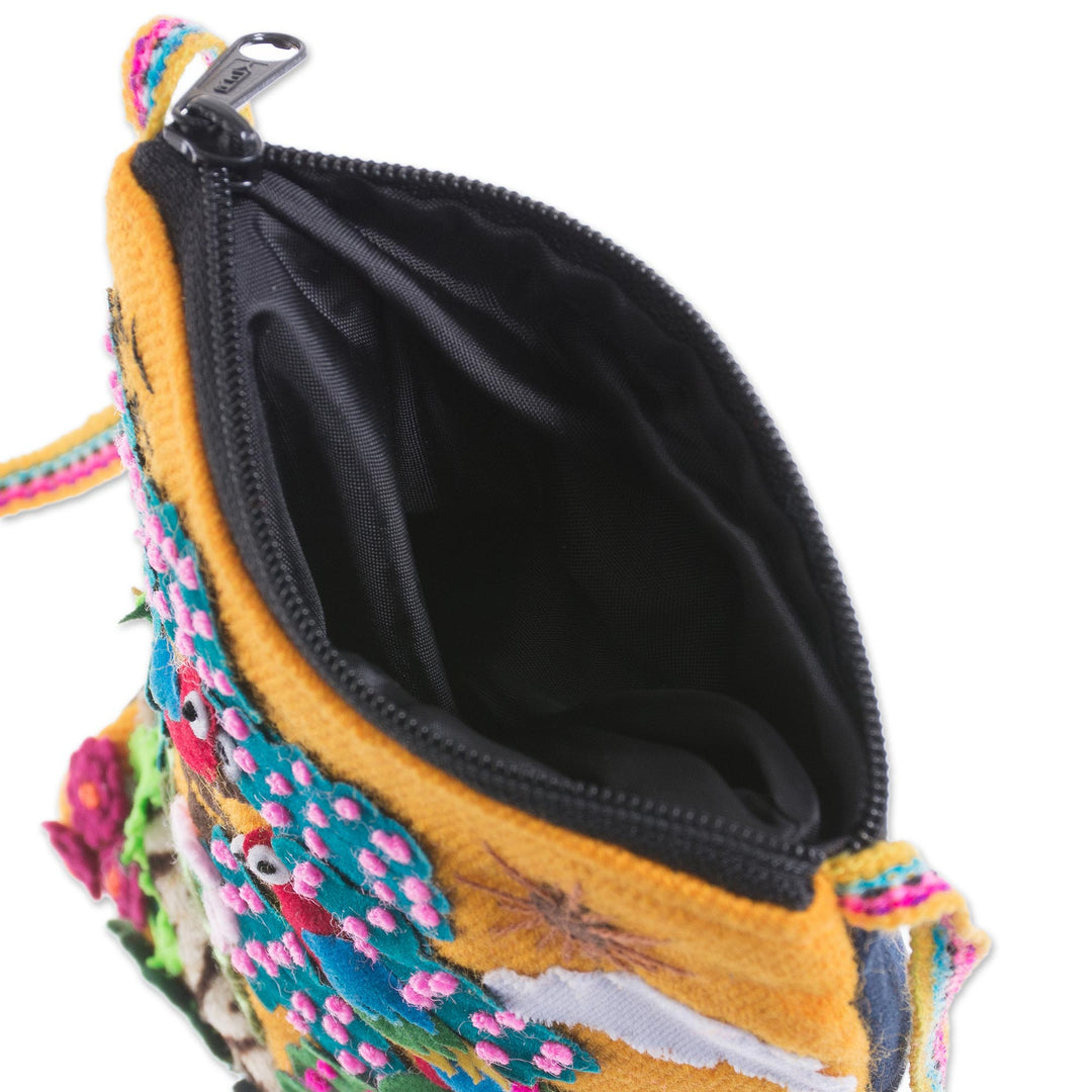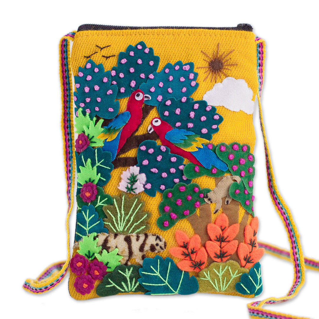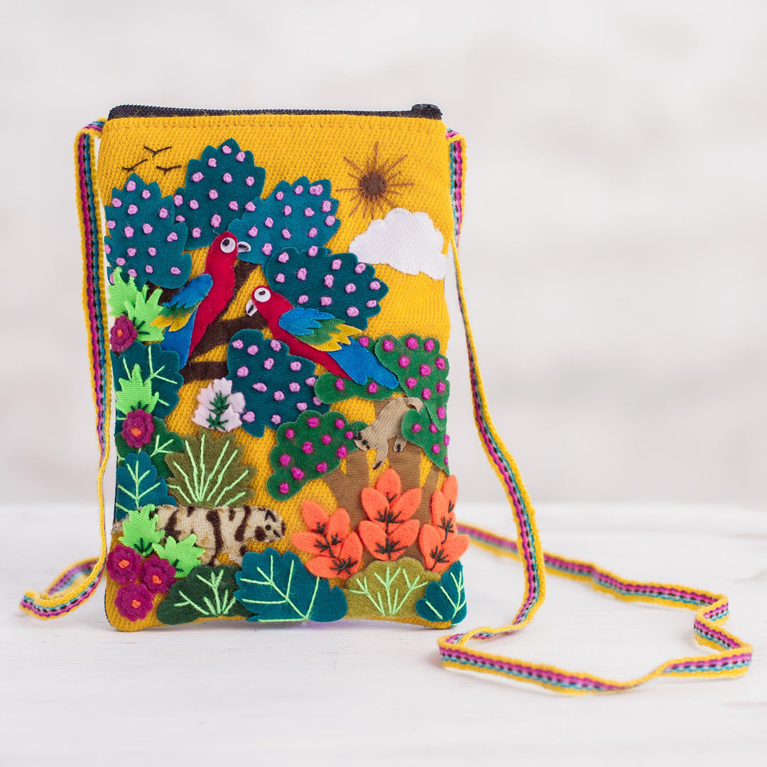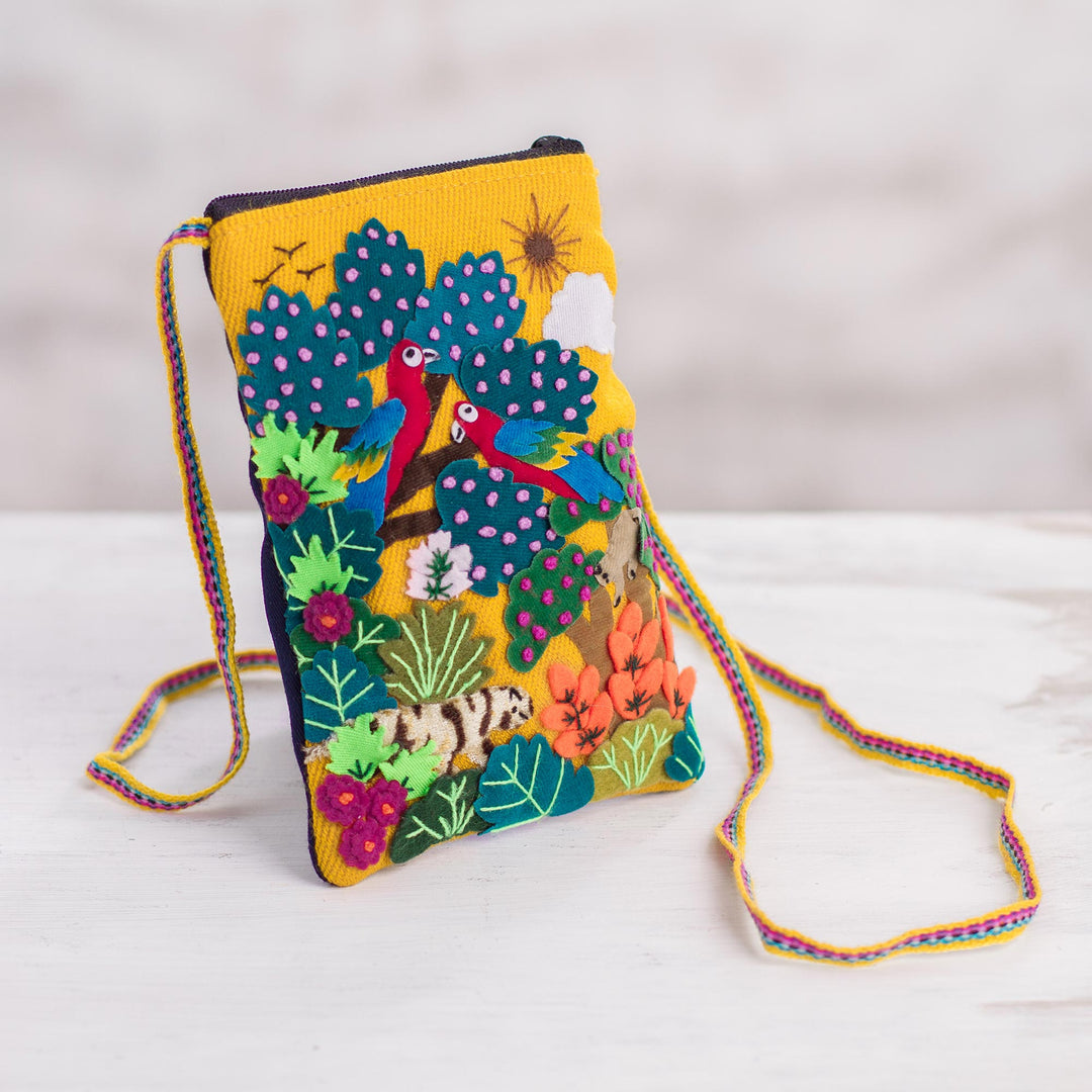 Peruvian artisan Maria Ramos Sanchez handcrafts this mobile phone case with an arpillera style front, in which cotton blend felt is appliquéd and embroidered to create an elaborate scene. The artisan was inspired by the beautiful Tambopata National Reserve of Peru, and fills this jungle scene with scarlet macaws perched in flowering trees, a tiger stalking through the foliage on the jungle floor, and a sloth peeking out from amongst the branches. This lovely, brightly colored scene is on a yellow background, and the back and lining of the bag are black. The single compartment is secured with a zipper and a long, colorful strap makes it easy to carry the case over the shoulder or across the body.