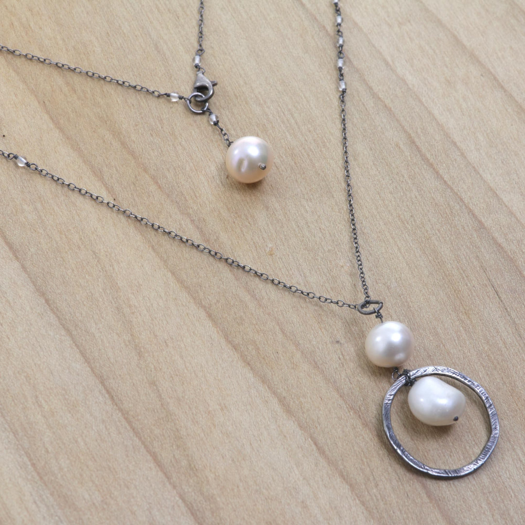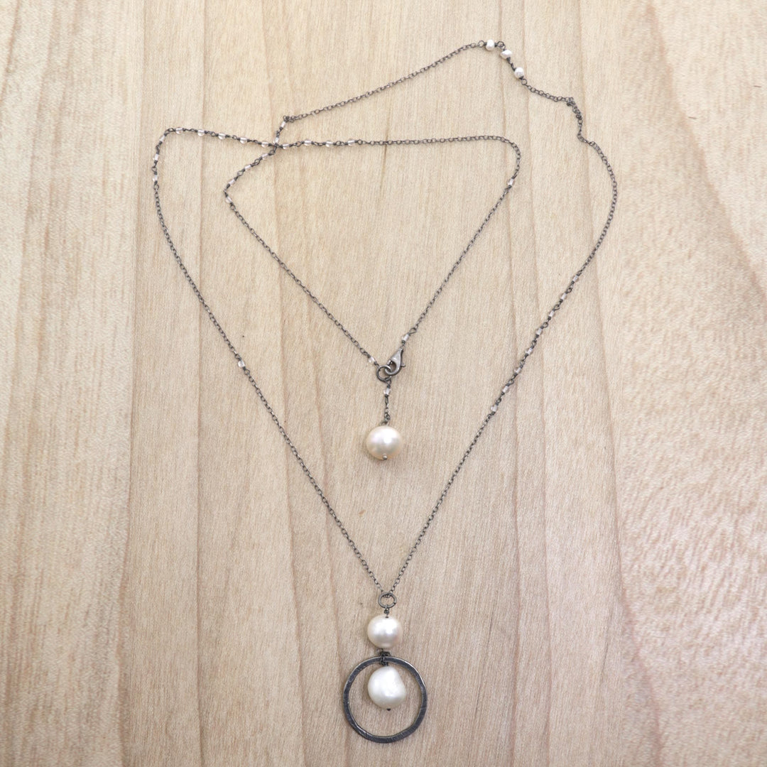 This pendant necklace features a cultured pearl pendant alongside dainty glowing moonstones. Indonesian artisan Ketut Sulastri crafts the long necklace by hand with a sterling silver chain and silver accents that feature a dark oxidized finish.