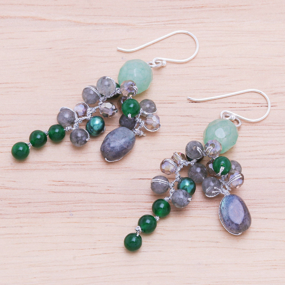 Thai artisan Nareerat combines cool-hued gemstones to create these funky dangle earrings. To craft the earrings, the artisan hand knots shimmering silk thread around clusters of faceted green quartz, green chalcedony, iridescent green pearls, labradorite stones, and grey glass beads. Elegant sterling silver hooks finish the pretty pair with a touch of cool shine.