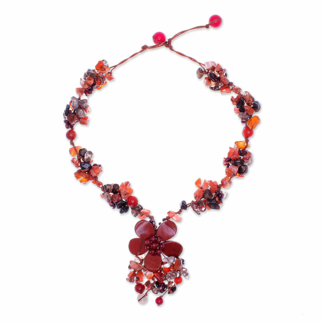 Glistening gems surround a jasper flower in a hand-knotted necklace by Thailand's Nareerat. She selects an elegant assortment of gems that include clusters of chip-cut garnet, carnelian, and smoky quartz. This fashionable accessory can be adjusted to the desired length.