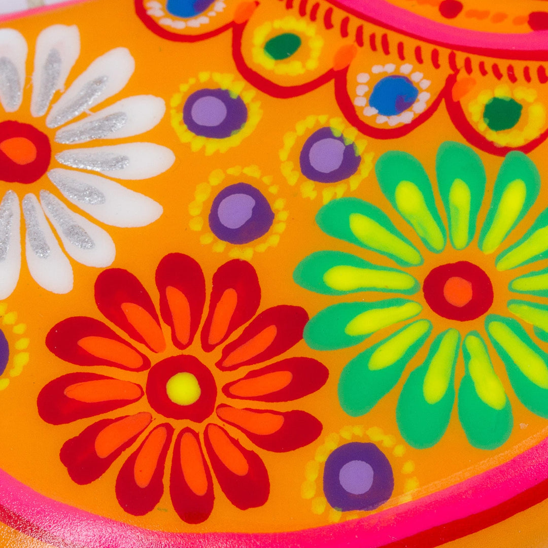 Crafted and painted by hand, two delightful doves bring color to your décor. Eufrosia Pantaleon works in ceramic, painting the festive keepsake ornaments in marigold orange. Motifs in red, green, blue and purple add charm to the design; the reverse side is solid yellow and bears the artisan's signature.