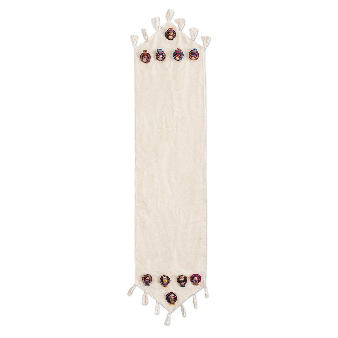 Guatemala's Lopez Garcia Family creates this delightful embellished table runner that is sure to be a conversation starter. The ivory cotton runner is embellished at both ends with quitapenas, or Guatemalan 'worry dolls'. According to legend, the princess Ixmucané was granted the ability to solve people's problems by the Sun God. Over time, people began to make tiny dolls in remembrance of Ixmucané. They would tell the dolls their problems in the hopes that Ixmucané would solve them. The custom became very popular, and continues to this day. The charming table runner is completed by ivory tassels at both ends.