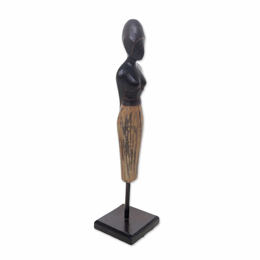 Faceless, this sculpture of a Balinese woman is highly expressive. Made Pastika carves the albesia sculpture by hand, portraying the woman with her hands behind her back, curious and serenely facing the horizon.