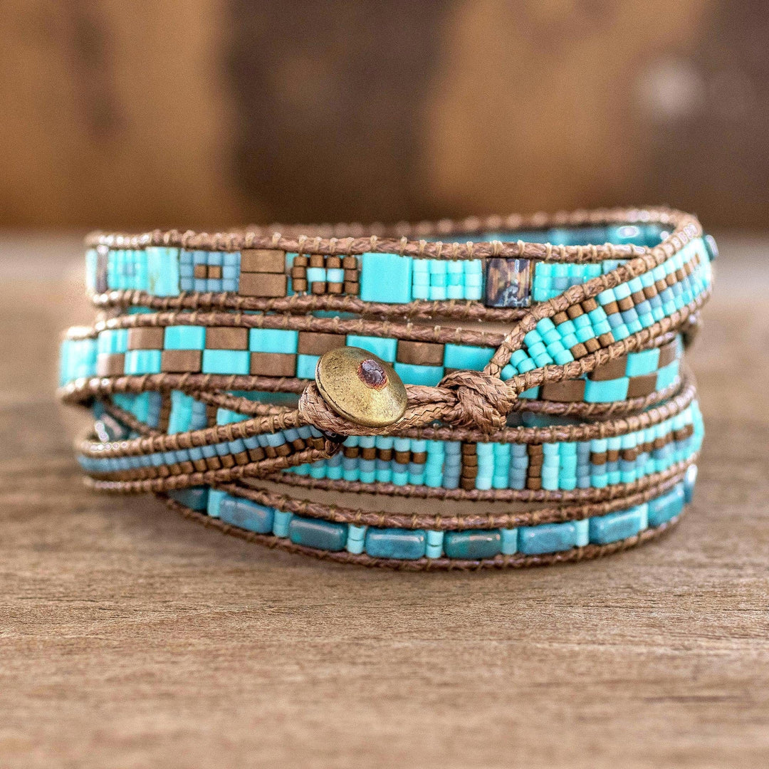 Petite glass beads in different shapes are meticulously strung on nylon cord using a small, specialized loom. Guatemalan artisan Cristóbal Ramírez designs and handcrafts this stylish wrap bracelet to feature colors of turquoise blue and bronze. It closes with an antiqued pewter button.