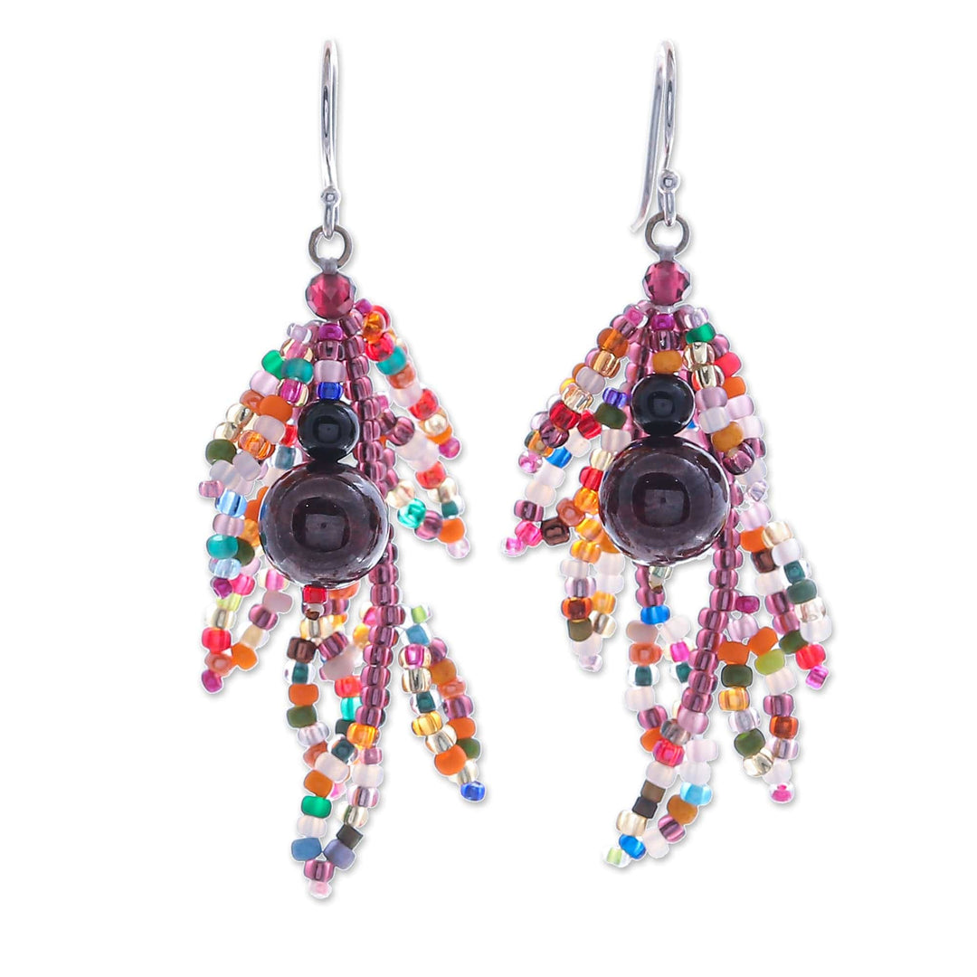 More than mere accessories, these vibrant dangle earrings are a bold fashion statement. Crafted by hand by combining garnet, agate and glass beads in lively shades, they create an alluring fusion of colors that captivates the eye. Hanging gracefully from sterling silver hooks, these earrings by Thai artisan Siriporn ooze style and glamor.
