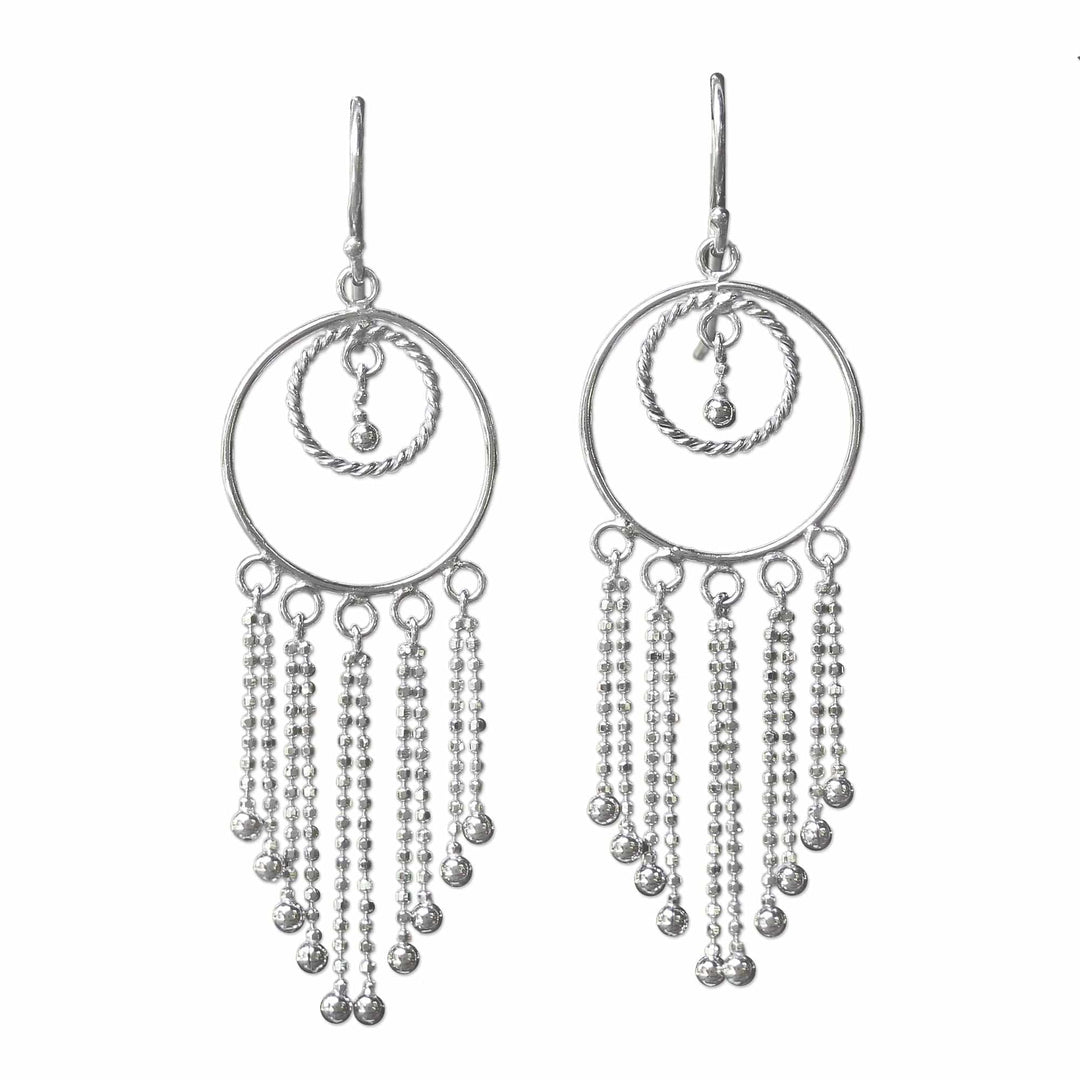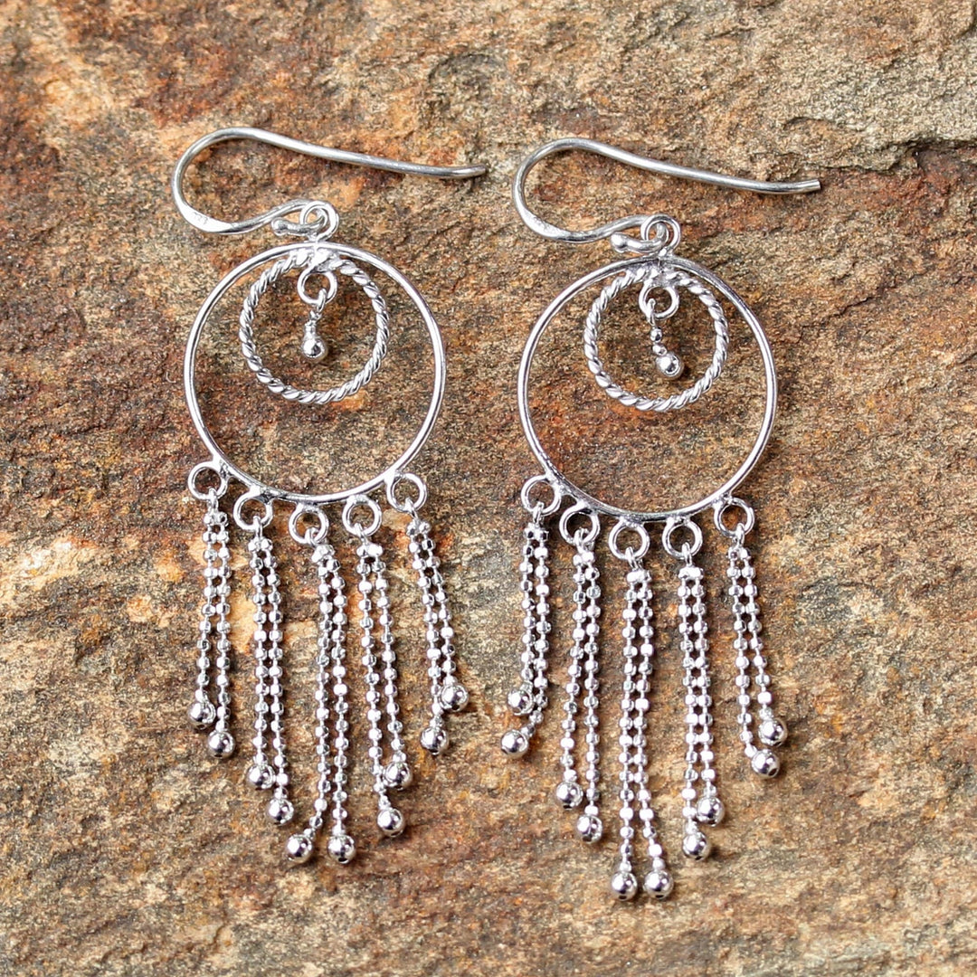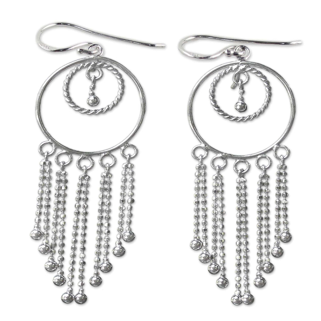 With the appearance of beautiful dream catchers, this pair of chandelier earrings is crafted from sterling silver in circular shapes, with delicate chain work dangling from each piece. Thai artisan Angels designs the earrings, drawing inspiration from the life work of her parents.