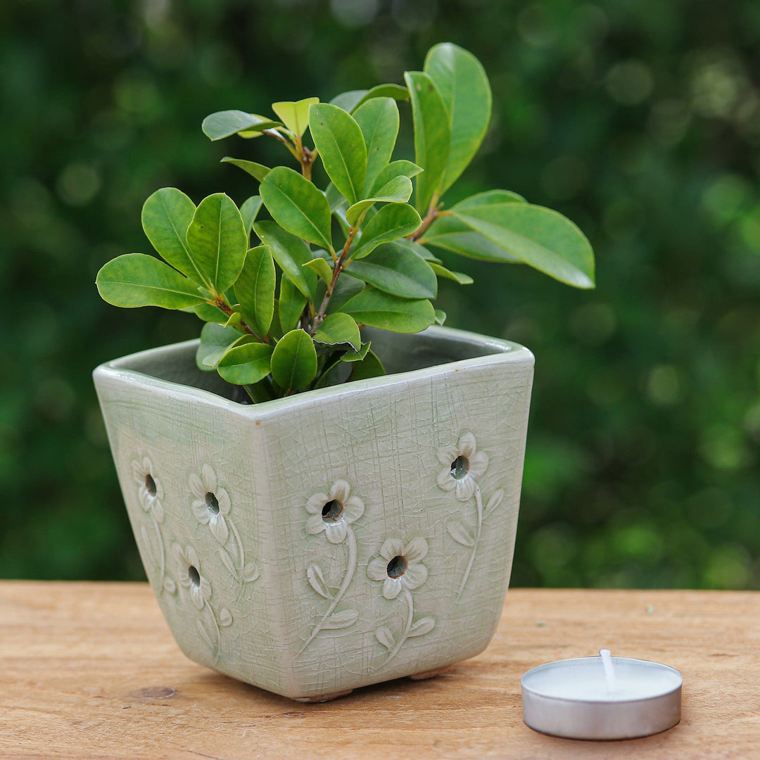 This charming celadon ceramic mini flower pot is the perfect haven for small plants. Boasting a stylish square shape and the distinctive crackled finish of celadon, Thai artisan Duangkamol’s splendid design also features a tranquil green glaze and delightful floral motifs.