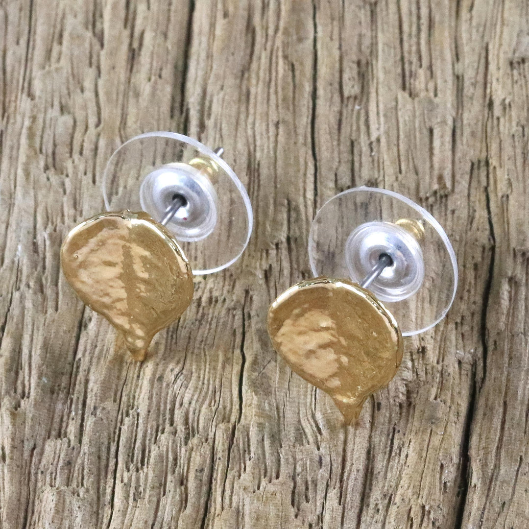 Shining with a high-polish finish, heart-shaped leaves of the million hearts plant are captured in this pair of Thai stud earrings. Local artisans carefully select the natural leaves, preserving them with a 22k gold plating. Presented by Danai, these stud earrings adorn the ears on posts of stainless steel.