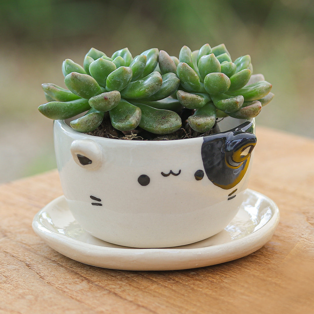 Handcrafted Cat-Shaped Ceramic Mini Flower Pot with Saucer - Kitty Magic