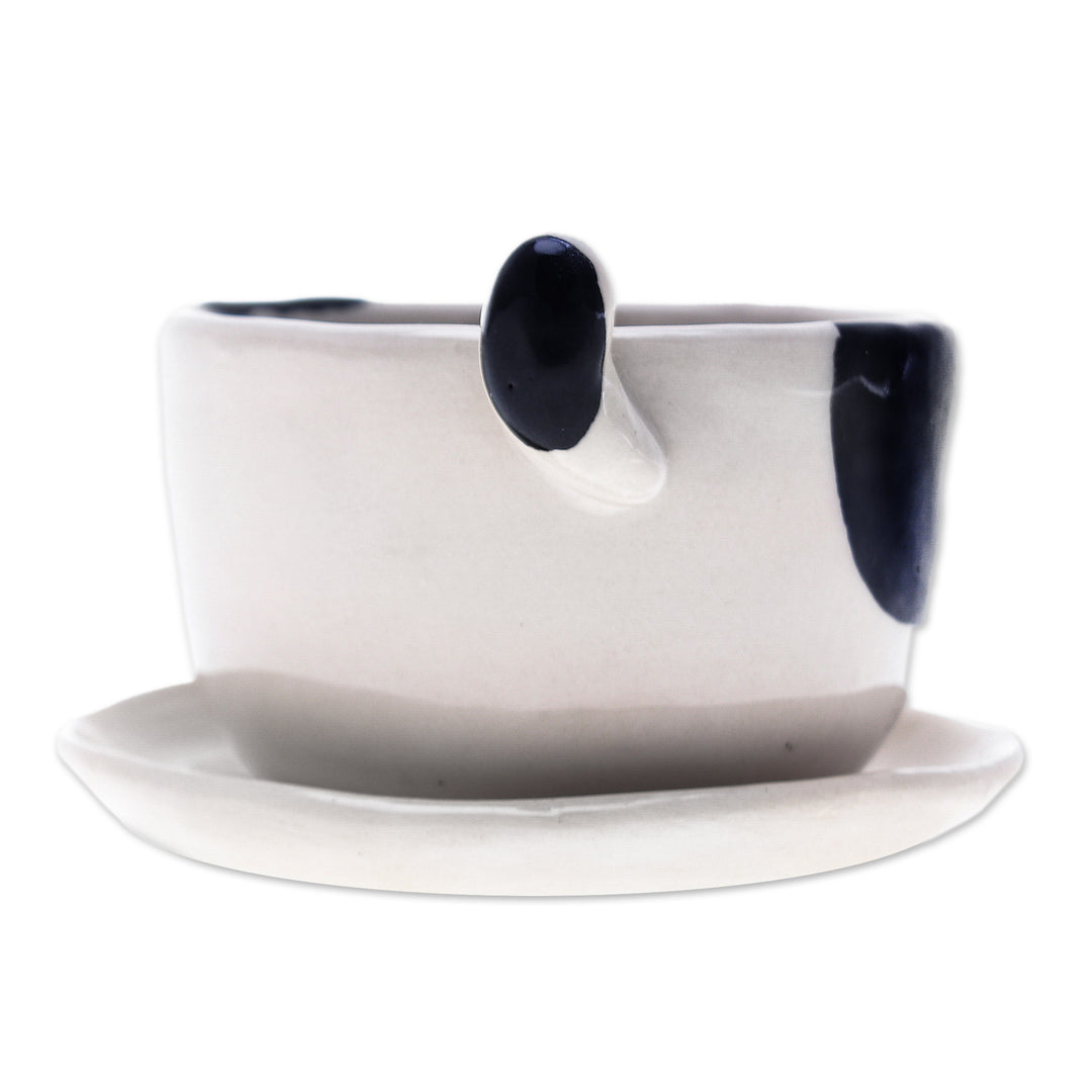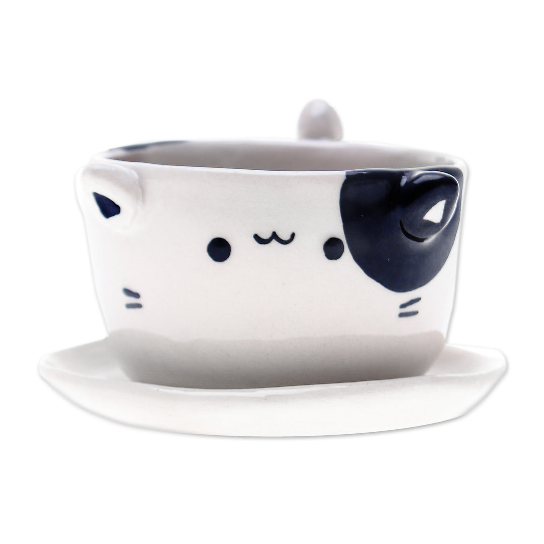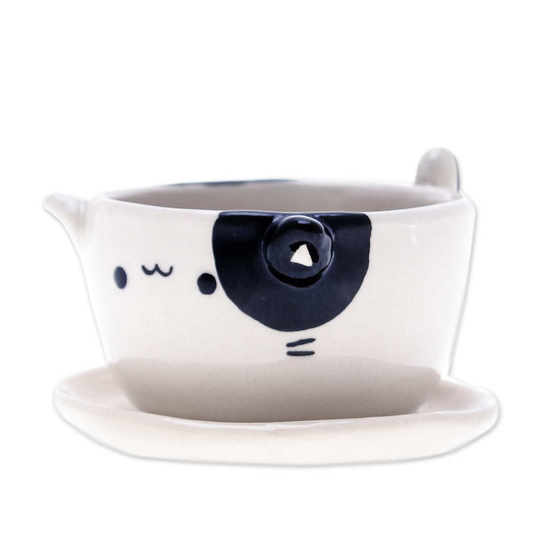 Brighten up your surroundings with this delightful glazed ceramic cat-themed mini flower pot expertly handcrafted by Thai artisan Paiboon. Whether gracing your table, nightstand or desk, its charming cat design in ivory and black and functional saucer will enhance any space effortlessly.