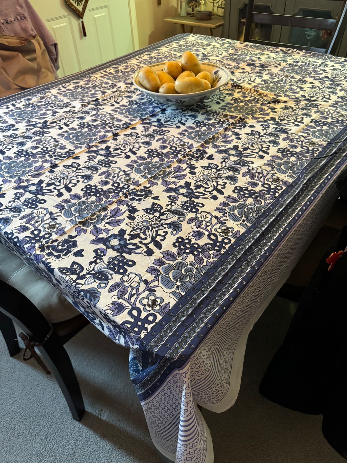Featuring a tablecloth, six placemats, and six napkins, this table linen set from India will bring the beauty of a royal garden to your home. Presented by Seema, the set is crafted of cotton, and the tablecloth hand-printed with blue floral motifs. Each placemat is printed with a border of purple flowers.
