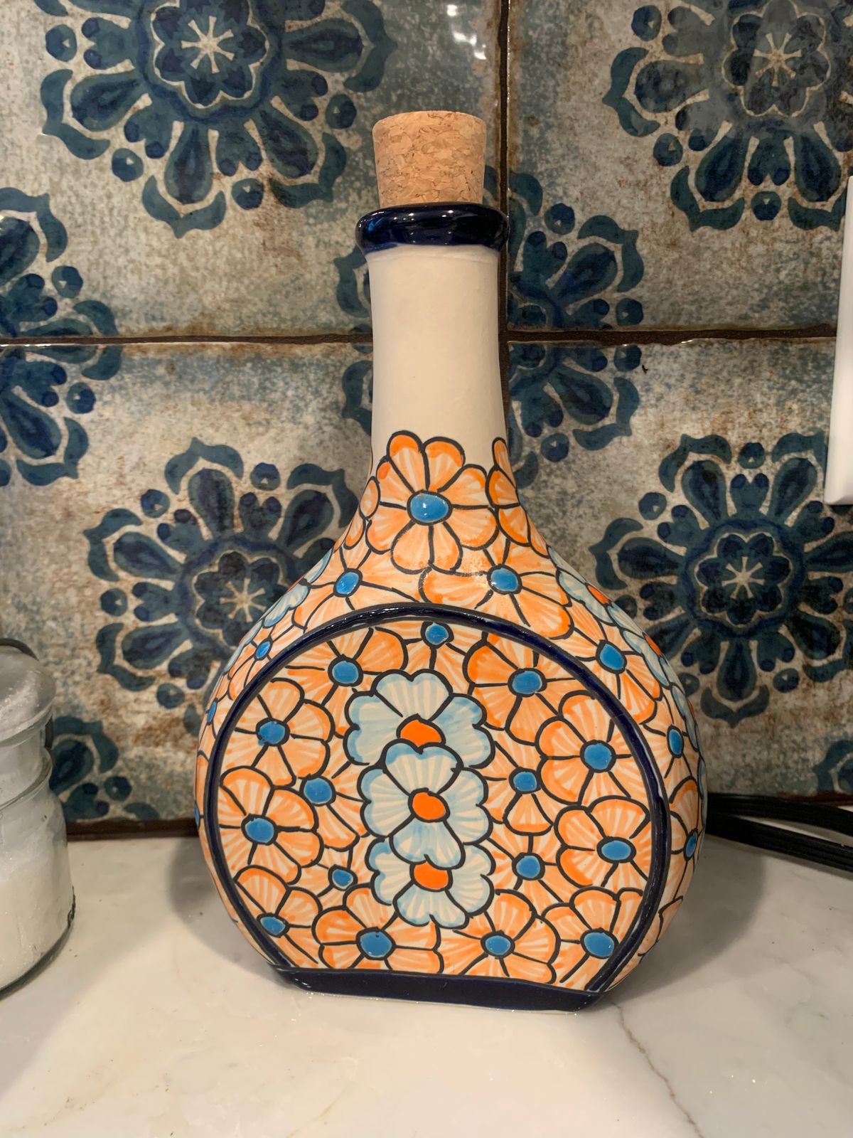 Mexican artisan Armando Sobreyra handcrafts this beautiful ceramic tequila decanter. Armando hand paints it in the traditional Talavera style with floral motifs in bright orange and light blue. The decanter is topped with a fitted cork that completes the look.