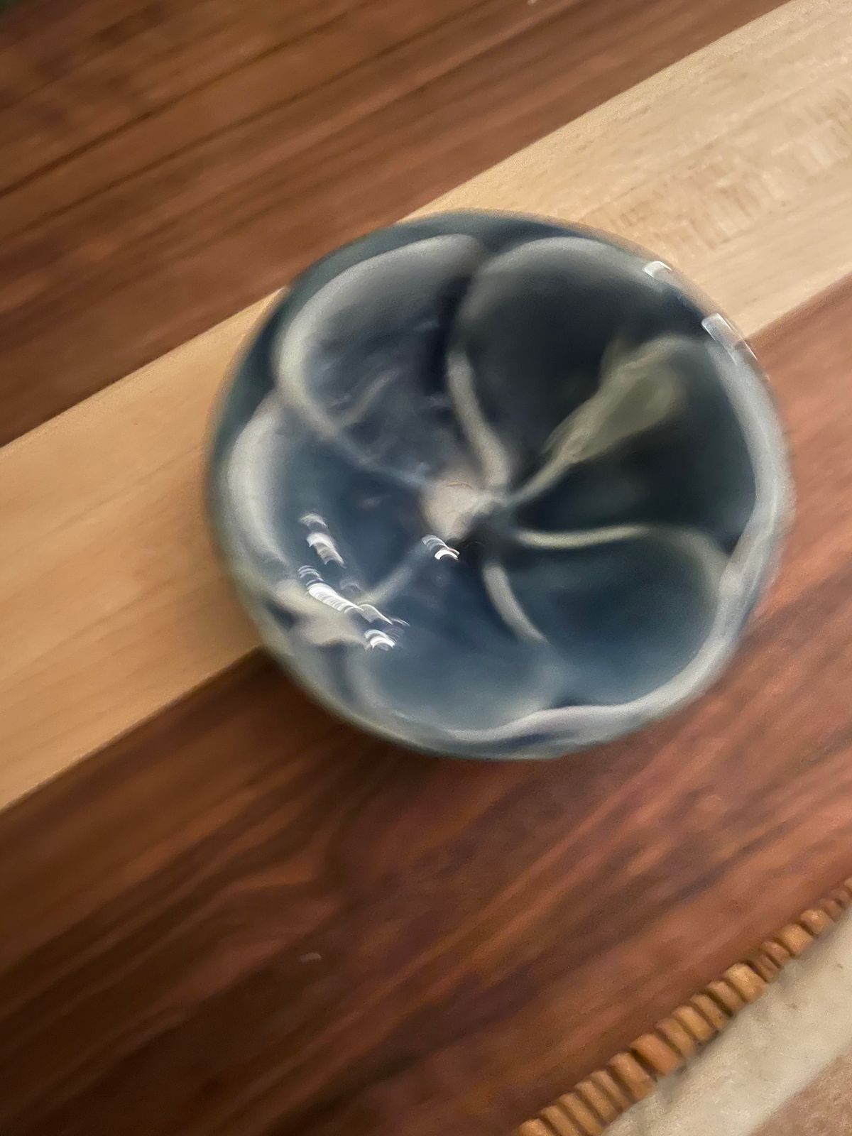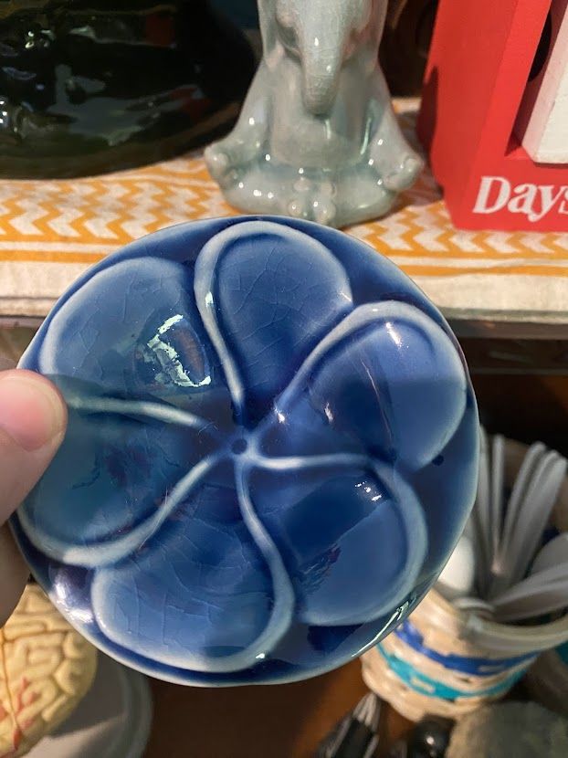 This darling candy dish is handcrafted from ceramic by Thai artisan Duangkamol. She works in the traditional Asian art of celadon to create the flower-shaped footed dish. A deep blue crackled glaze enhances the beauty of the small dish.
