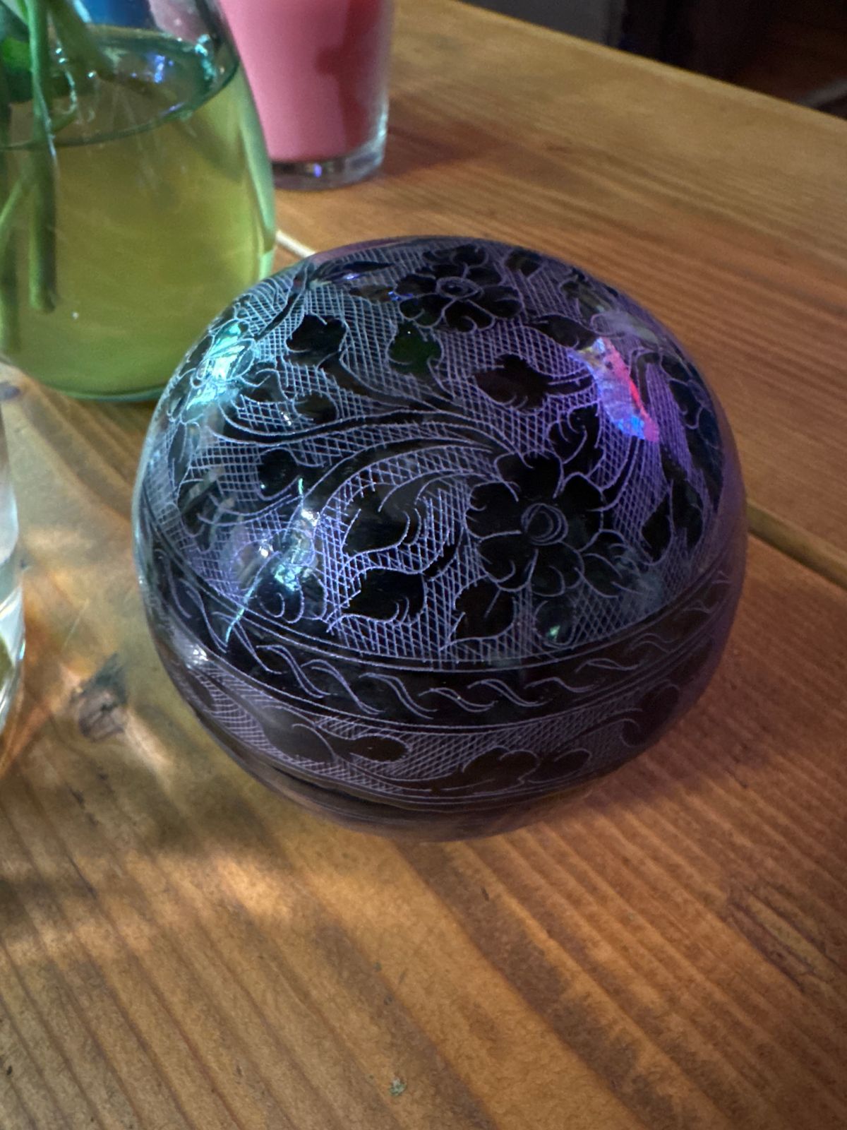 Carving mango wood into spheres, Nantana Sompamitre creates a pair of delightful boxes. A violet motif adorns their smooth, lacquered surfaces. Sompamitre carves the desired shape and coats it with lacquer. Once dried it is polished, and another coat is applied, up to twenty times, before as many six coats of pure lacquer are present. The final layer is polished with powdered fired clay. Then the motifs are etched with a technique called lai kad (dug-out pattern) and painted.
