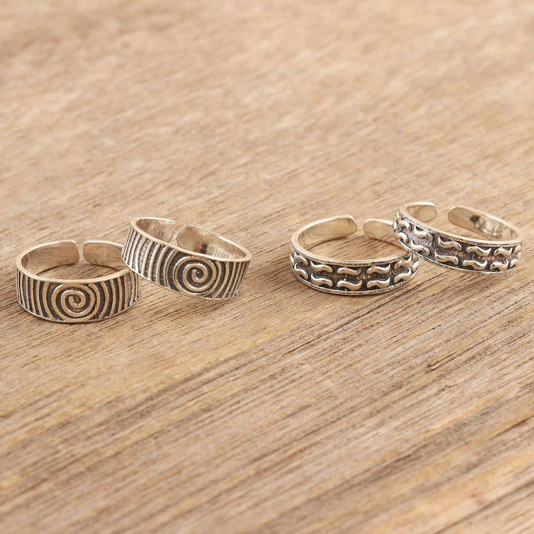 Sterling Silver Toe Rings in a Combination Finish - Set of 2 - Spirals and Lines