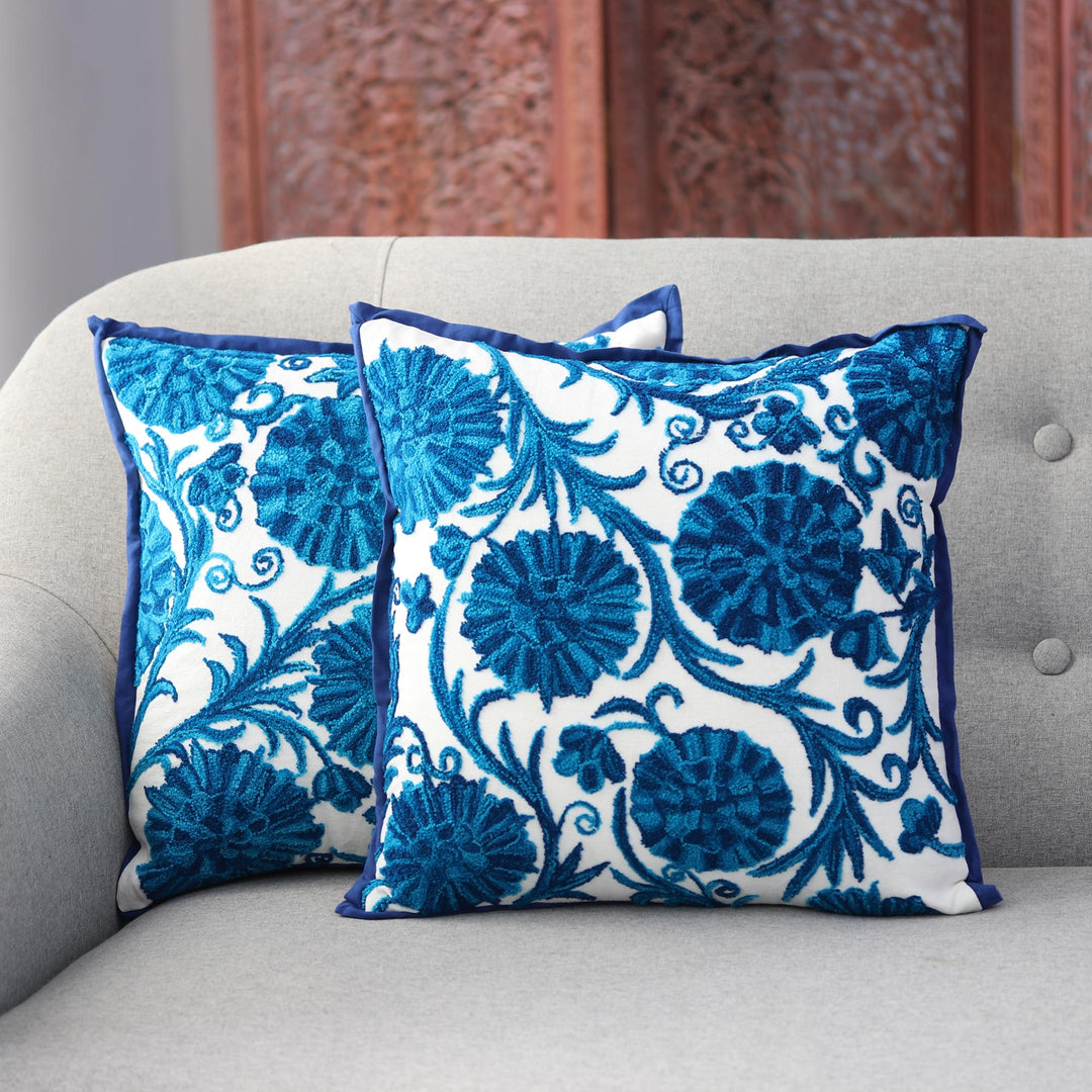 Blue Floral Embroidered Cushion Covers from India (pair) - Blue Dahlias