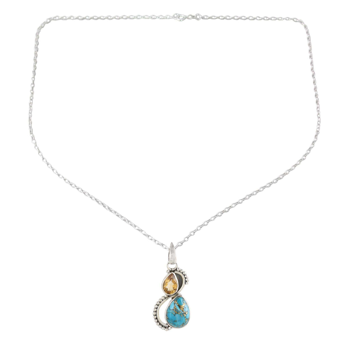 A 1.5-carat citrine nestles beside a teardrop of sky blue composite turquoise in a design that celebrates their differences. From Shanker in India, this beautiful necklace is handcrafted of sterling silver to showcase the lovely gems.